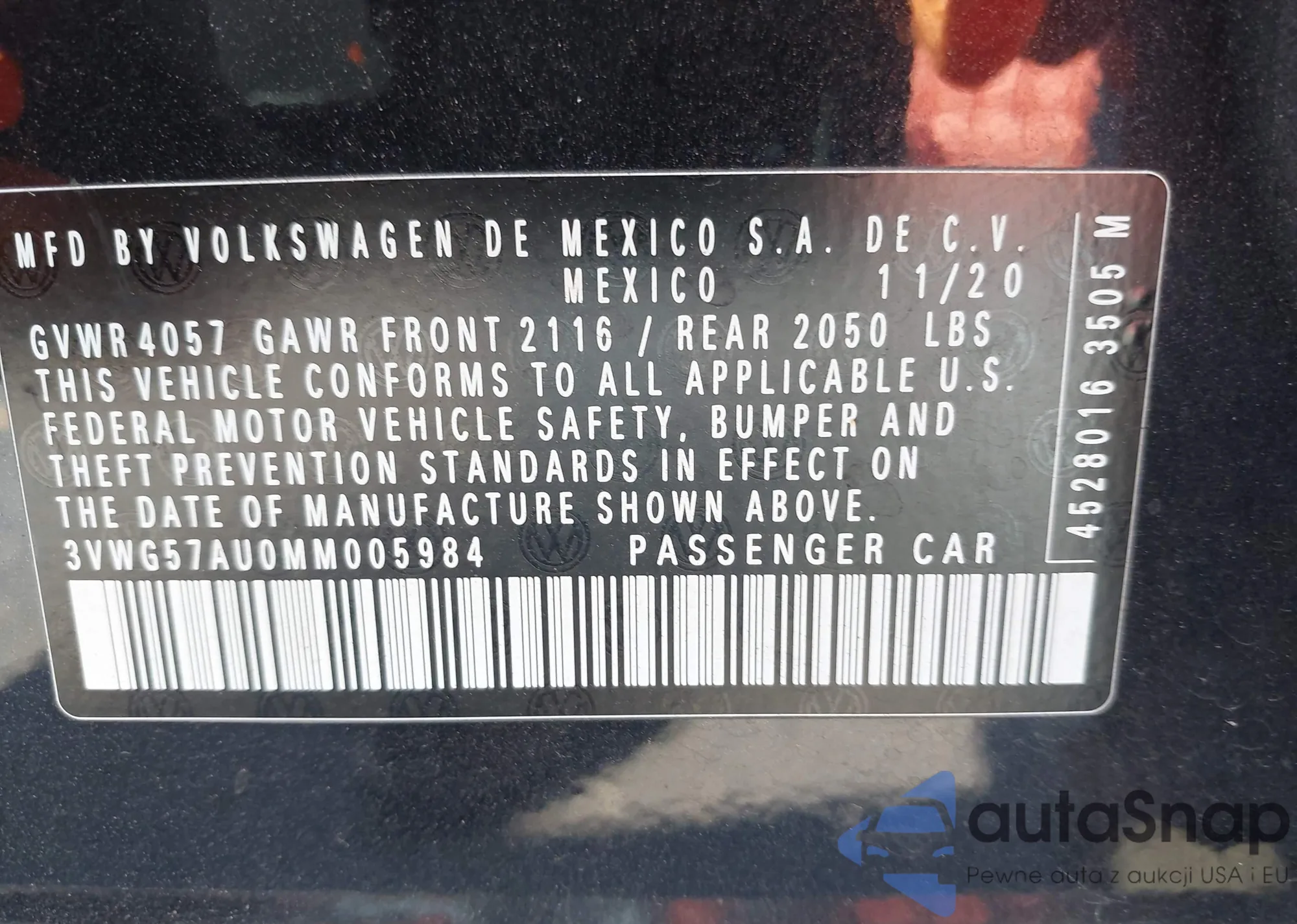 Samochód Volkswagen Golf 2021 (VIN 3VWG57AU0MM005984) nie był wcześniej licytowany. Dokumenty są czyste, przebieg odpowiada lub jest niższy niż średnia rynku. Sprzedaje go firma ubezpieczeniowa – polecamy zakup. Dostawa do portu zajmie ok. 6–8 tygodni.