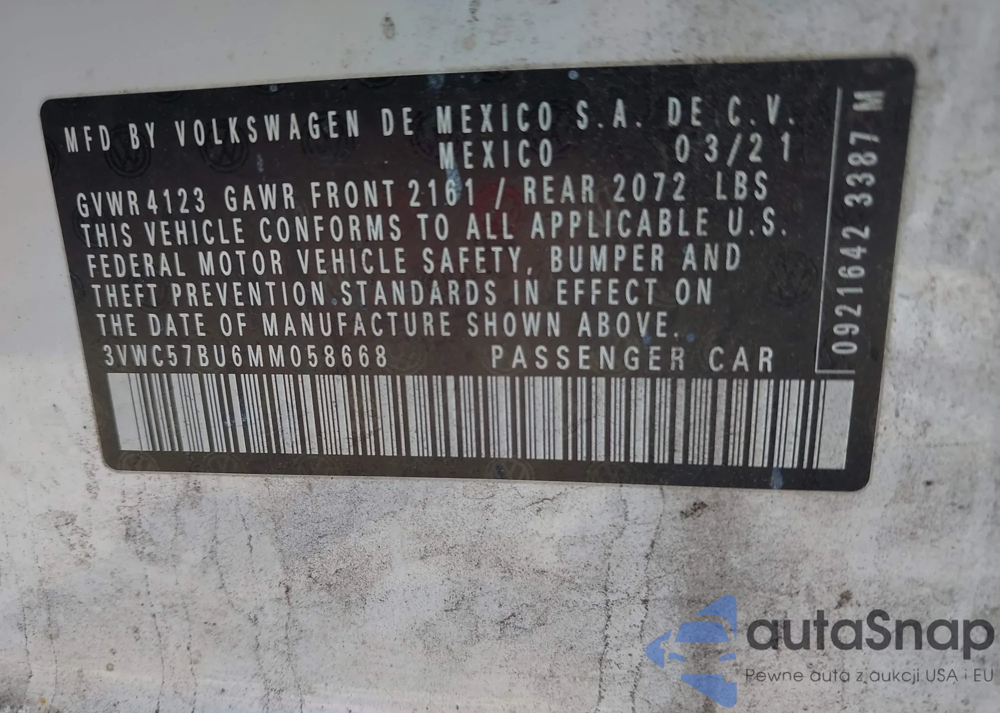 • VIN: 3VWC57BU6MM058668
