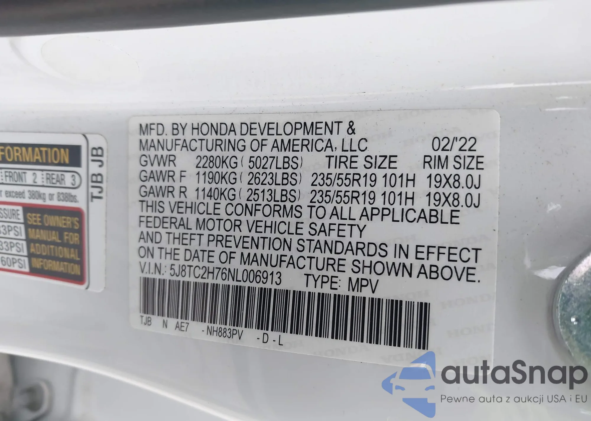 VIN: 5J8TC2H76NL006913