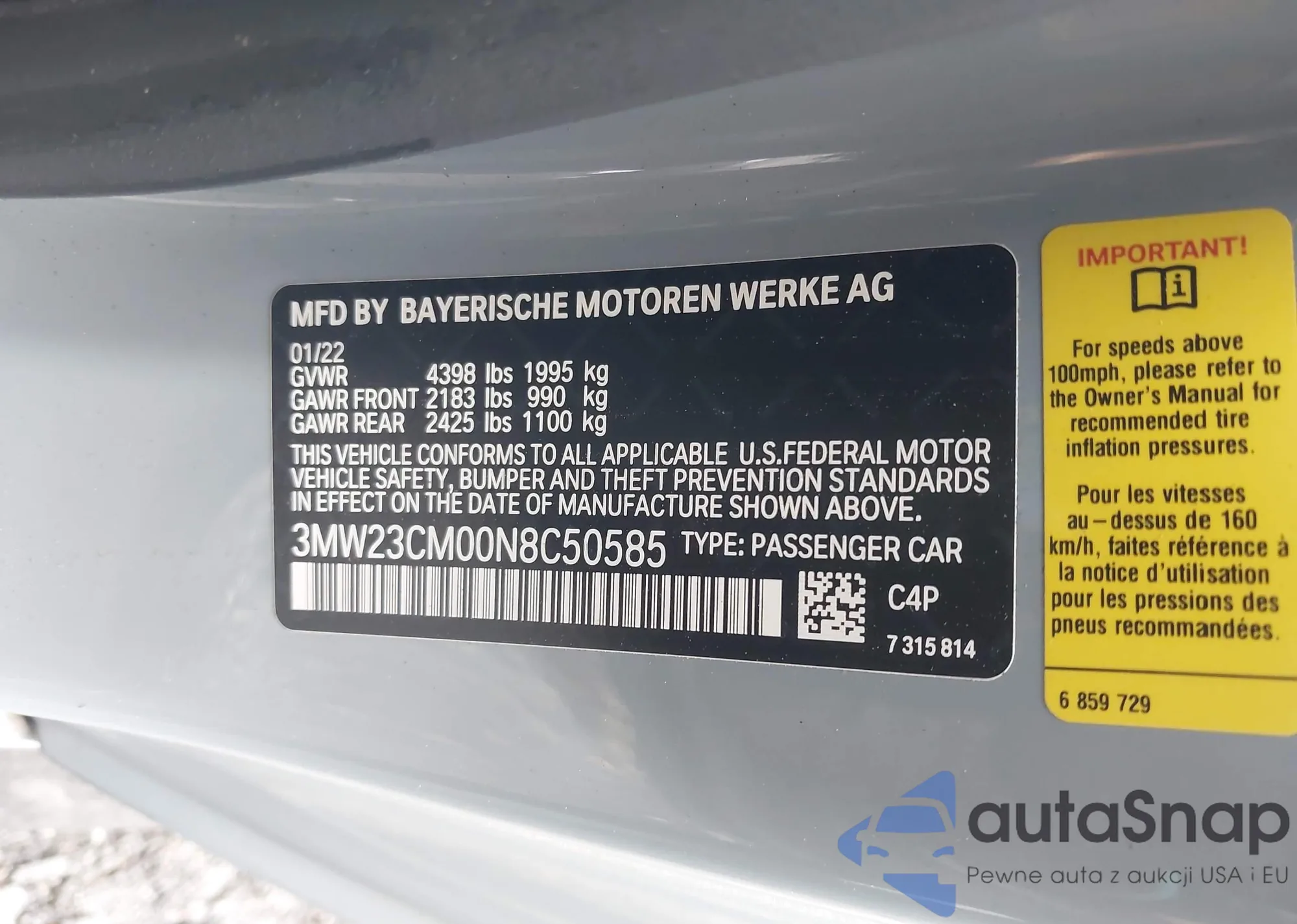 Samochód BMW 2er 2022 (VIN 3MW23CM00N8C50585) nie był wcześniej licytowany. Dokumenty są czyste, przebieg odpowiada lub jest niższy niż średnia rynku. Sprzedaje go firma ubezpieczeniowa – polecamy zakup. Dostawa do portu zajmie ok. 6–8 tygodni.