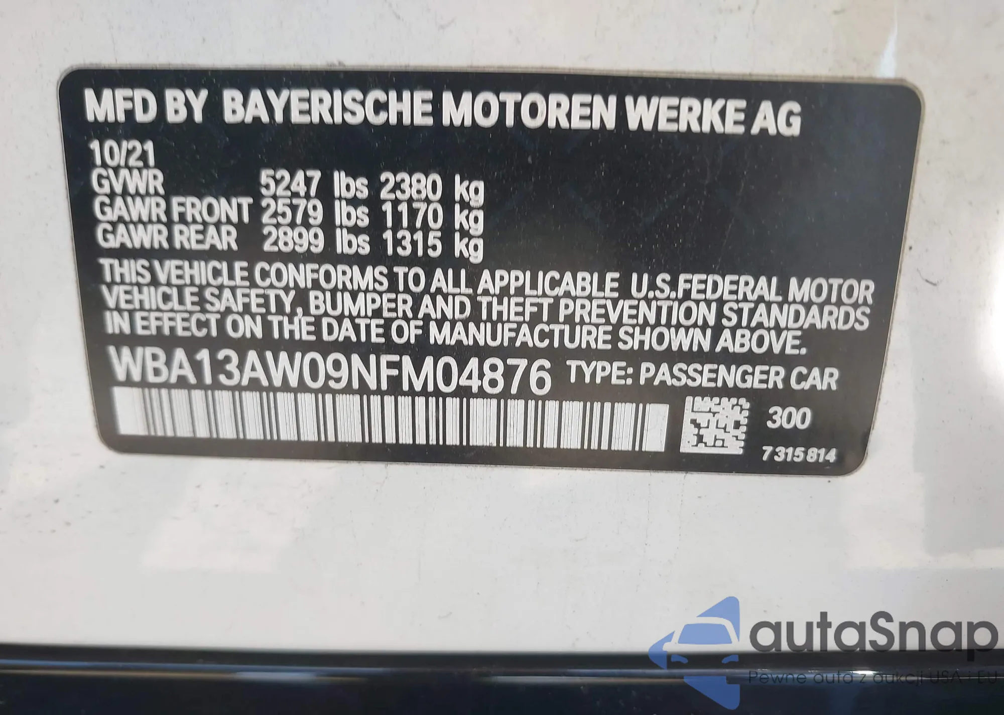 VIN: WBA13AW09NFM04876