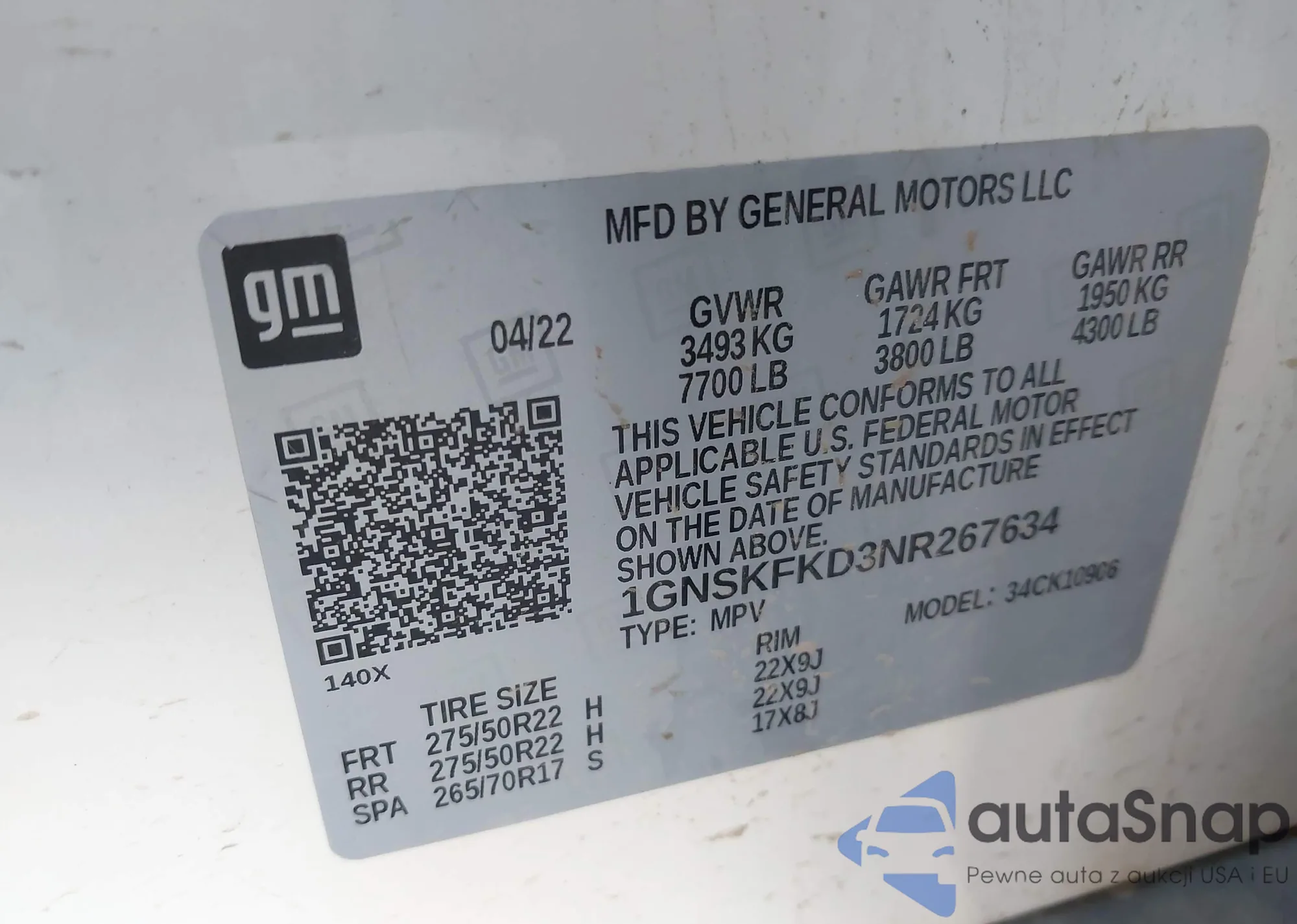 Samochód Chevrolet Suburban 2022 (VIN 1GNSKFKD3NR267634) ma dokumenty uniemożliwiające rejestrację. Mogą pojawić się trudności przy eksporcie i rejestracji. Skontaktuj się z ekspertami AutaSnap w celu znalezienia alternatywy.