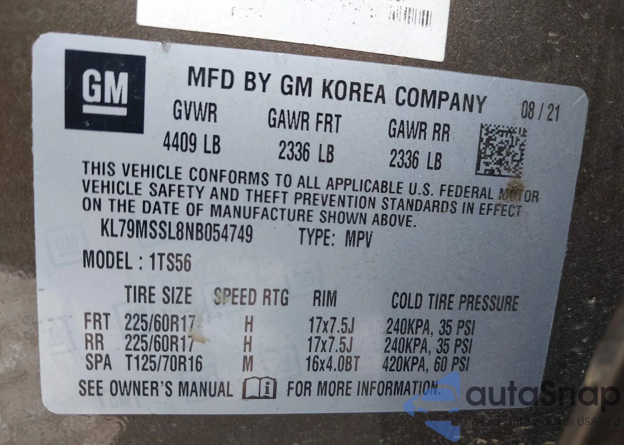VIN: KL79MSSL8NB054749