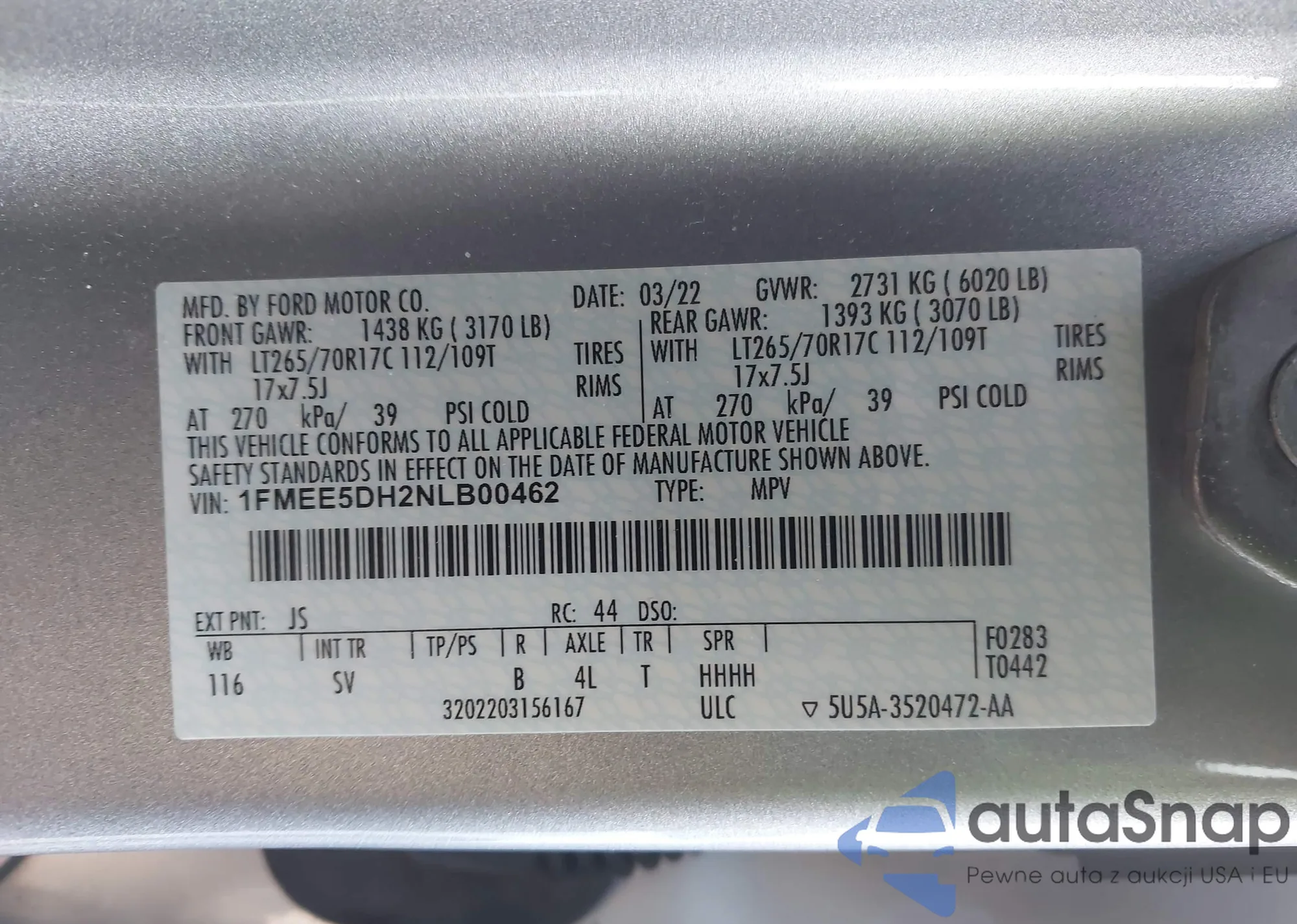 • VIN: 1FMEE5DH2NLB00462