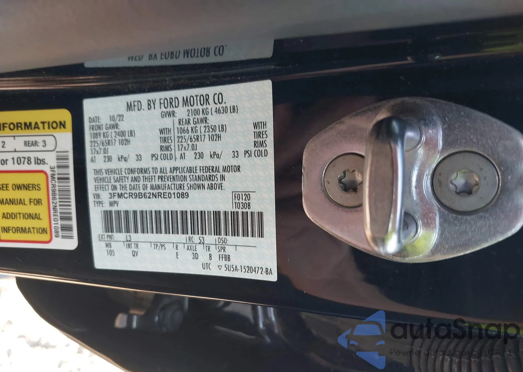 Samochód Ford Bronco Sport 2022 (VIN 3FMCR9B62NRE01089) nie był wcześniej licytowany. Dokumenty są czyste, przebieg odpowiada lub jest niższy niż średnia rynku. Sprzedaje go firma ubezpieczeniowa – polecamy zakup. Dostawa do portu zajmie ok. 6–8 tygodni.