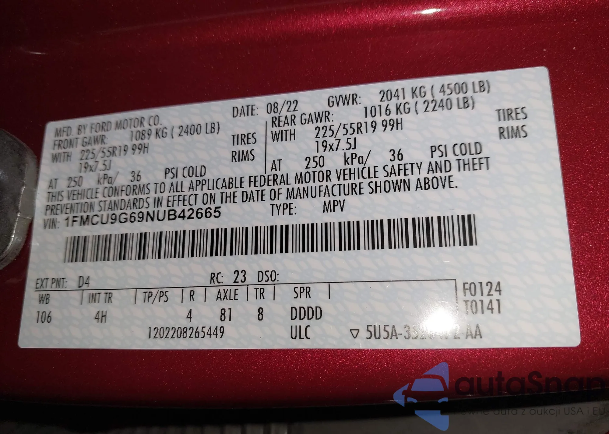 • VIN: 1FMCU9G69NUB42665