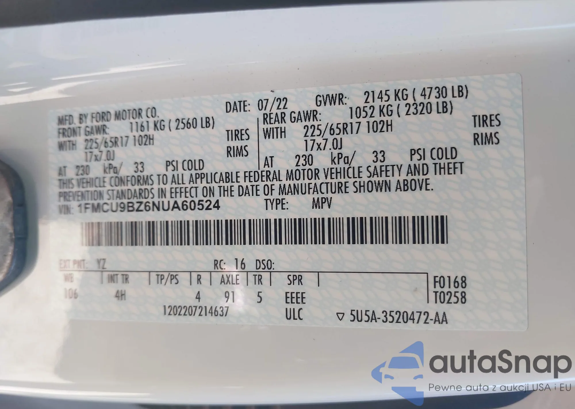 VIN: 1FMCU9BZ6NUA60524