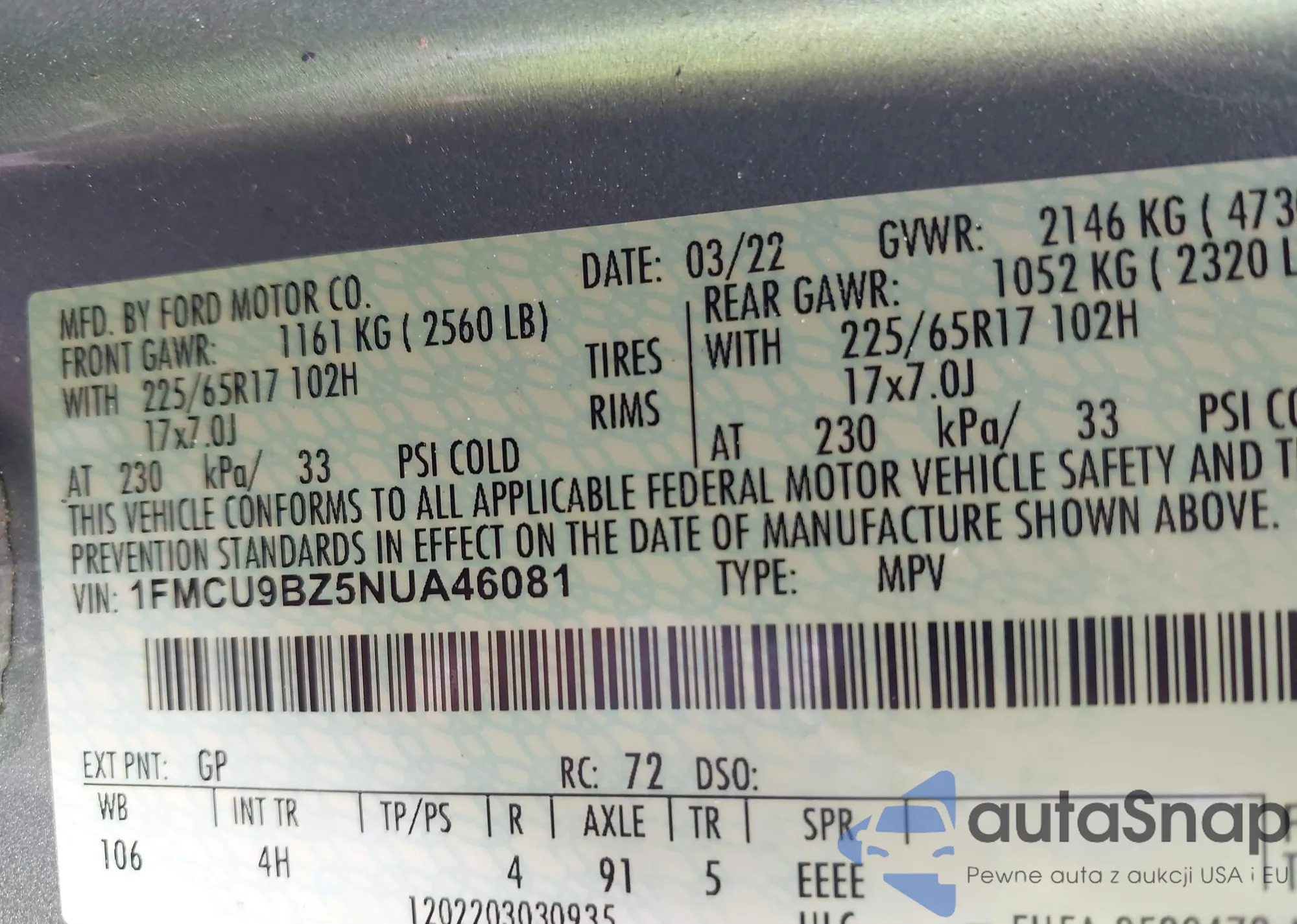 VIN: 1FMCU9BZ5NUA46081