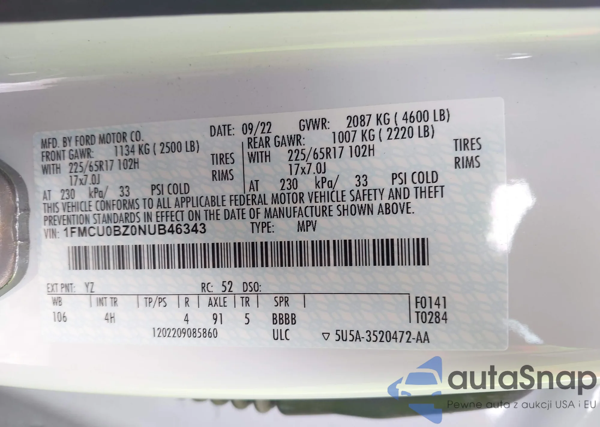 VIN: 1FMCU0BZ0NUB46343