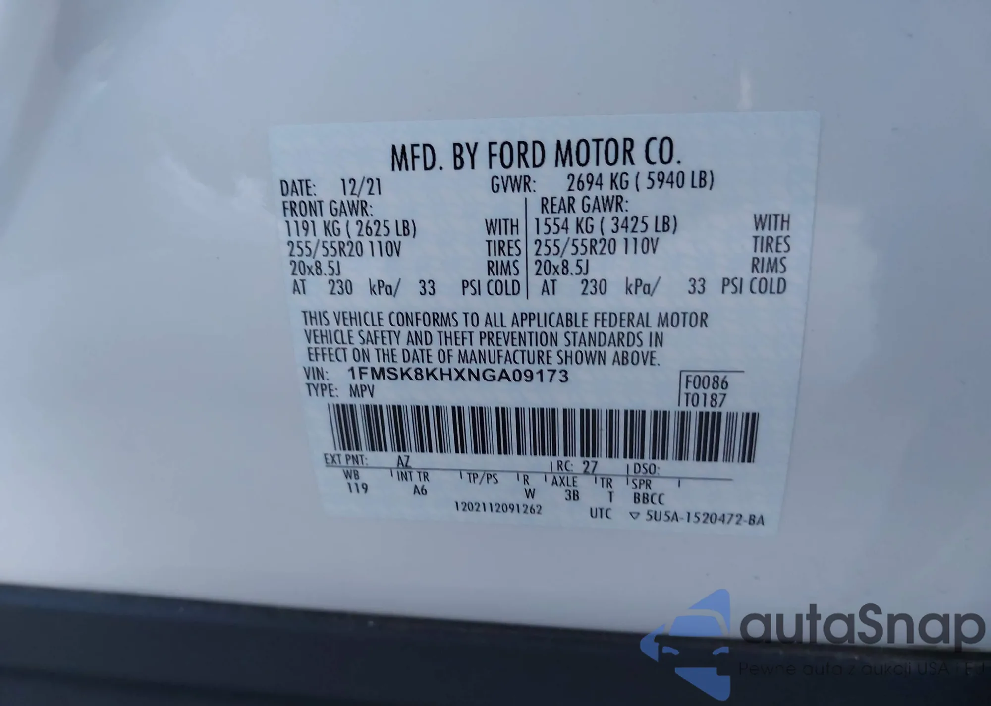 VIN: 1FMSK8KHXNGA09173