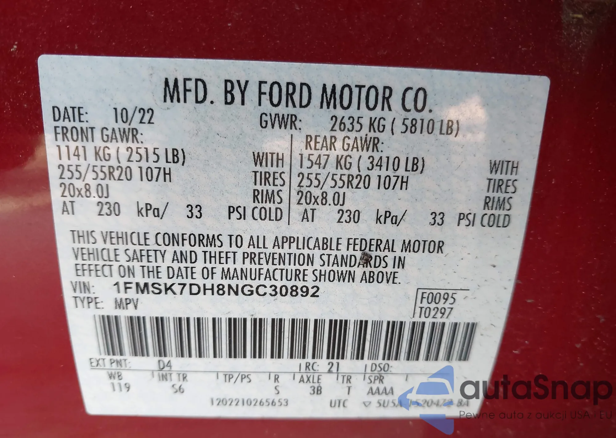 • VIN: 1FMSK7DH8NGC30892