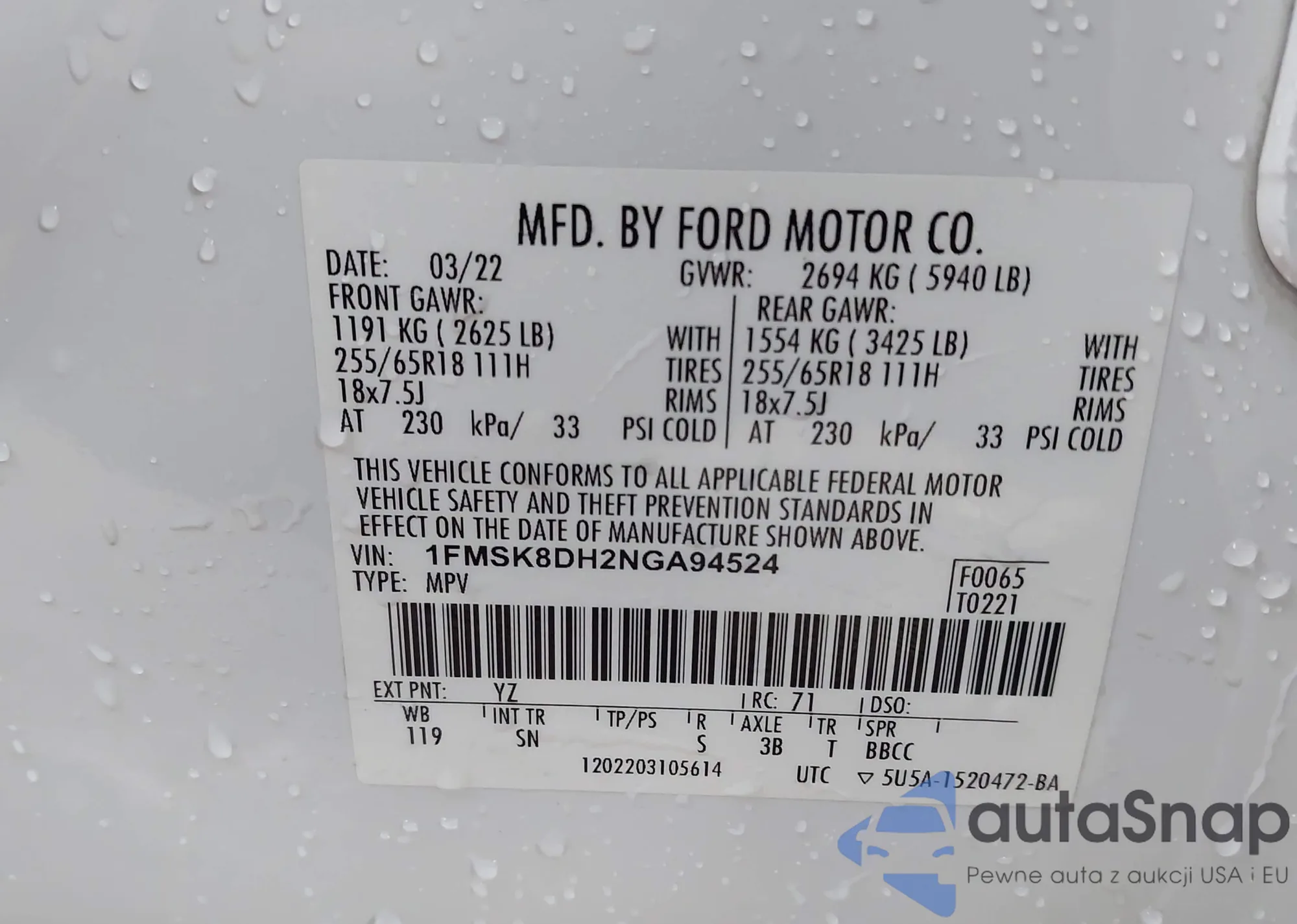 VIN: 1FMSK8DH2NGA94524