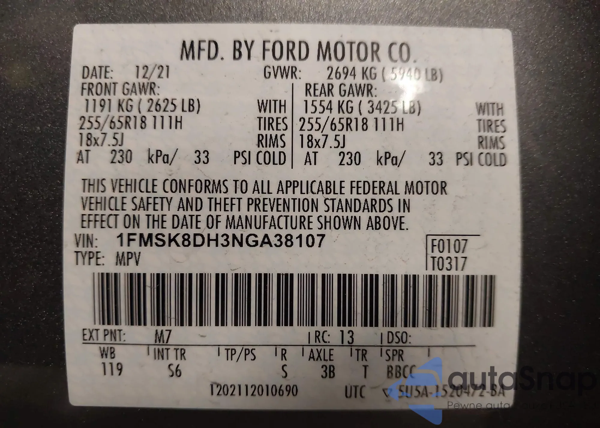 • VIN: 1FMSK8DH3NGA38107