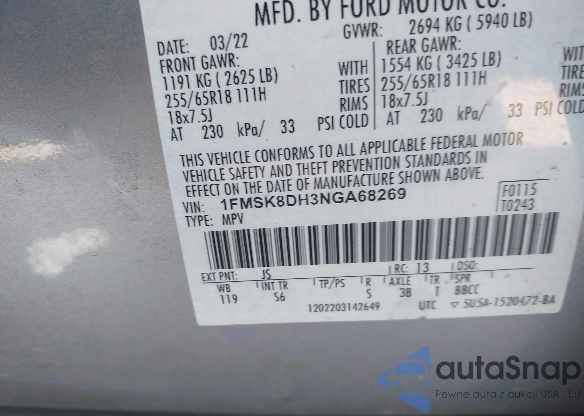 VIN: 1FMSK8DH3NGA68269