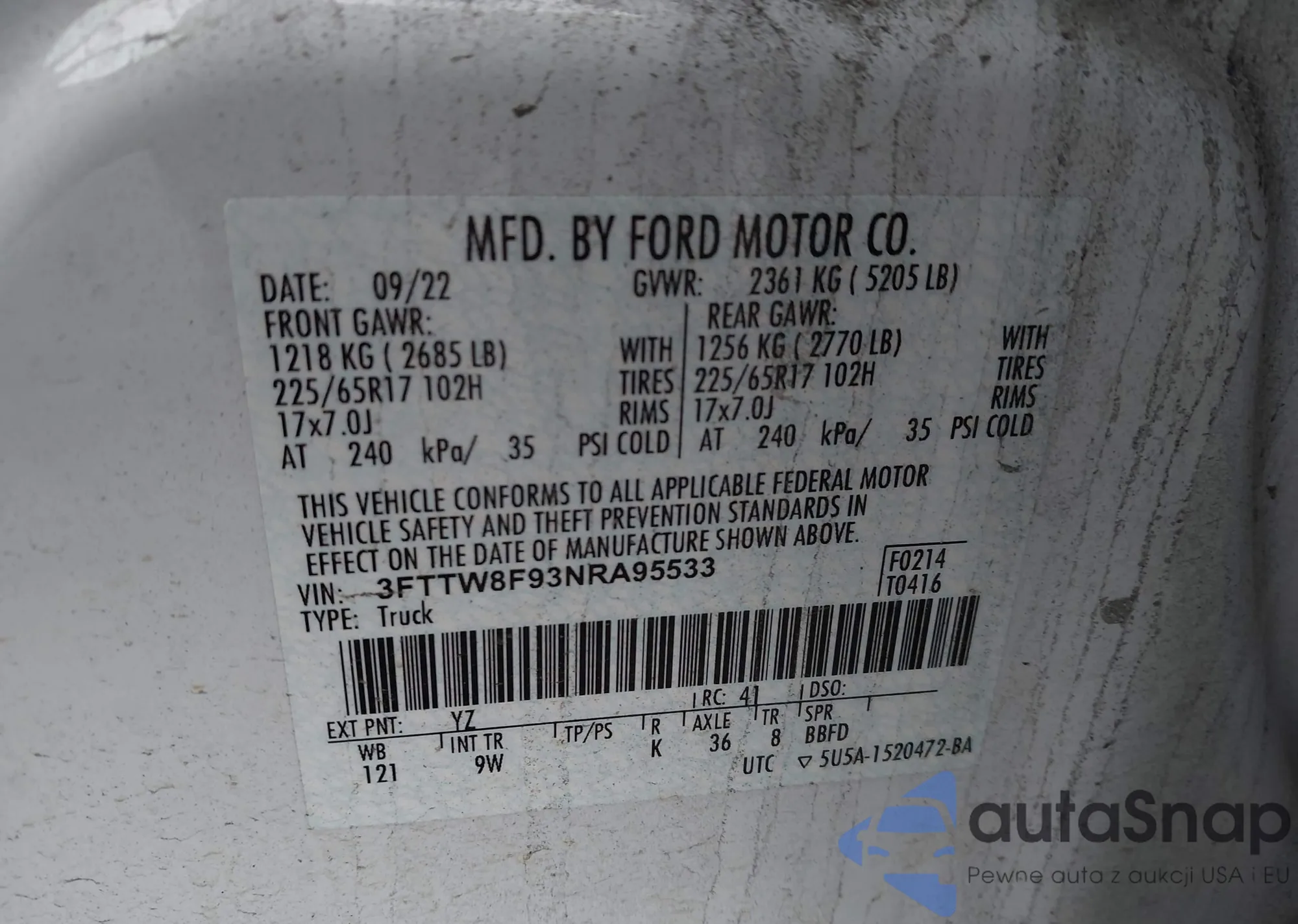 • VIN: 3FTTW8F93NRA95533