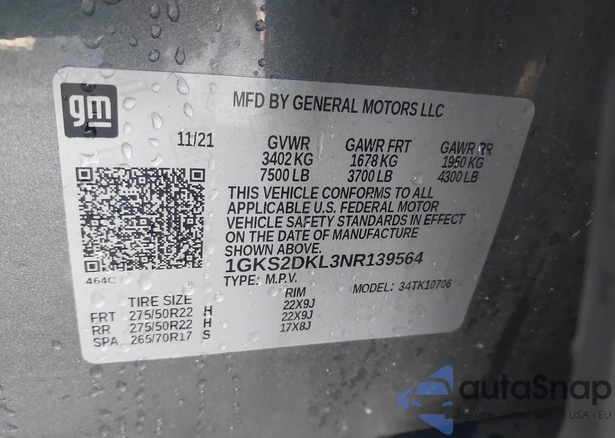 Samochód GMC Yukon 2022 (VIN 1GKS2DKL3NR139564) ma dokumenty uniemożliwiające rejestrację. Mogą pojawić się trudności przy eksporcie i rejestracji. Skontaktuj się z ekspertami AutaSnap w celu znalezienia alternatywy.