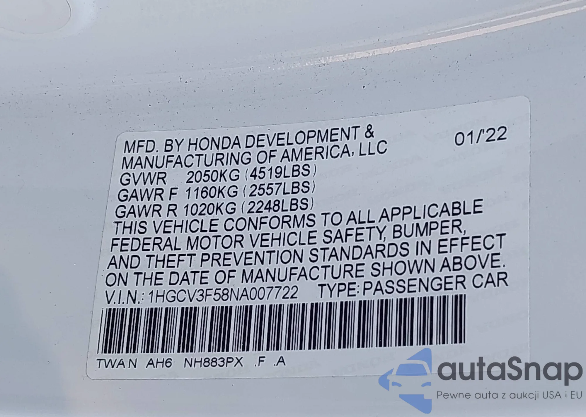 • VIN: 1HGCV3F58NA007722