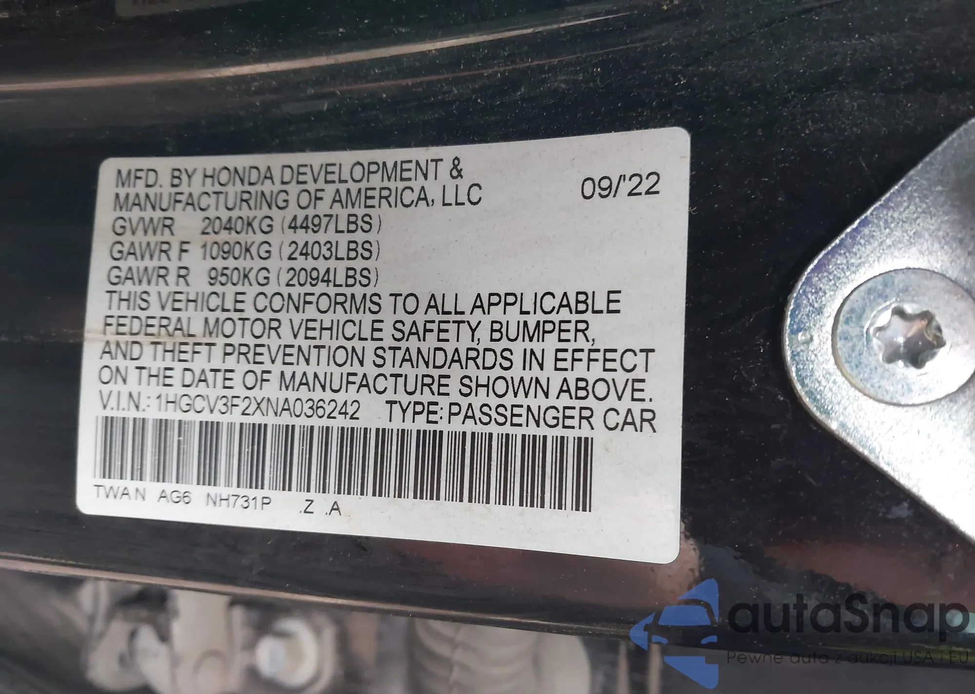 VIN: 1HGCV3F2XNA036242