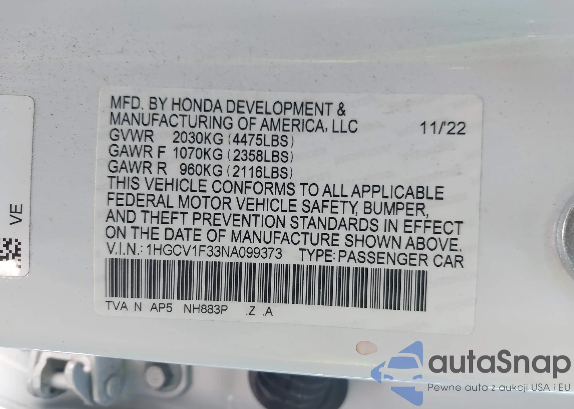 VIN: 1HGCV1F33NA099373
