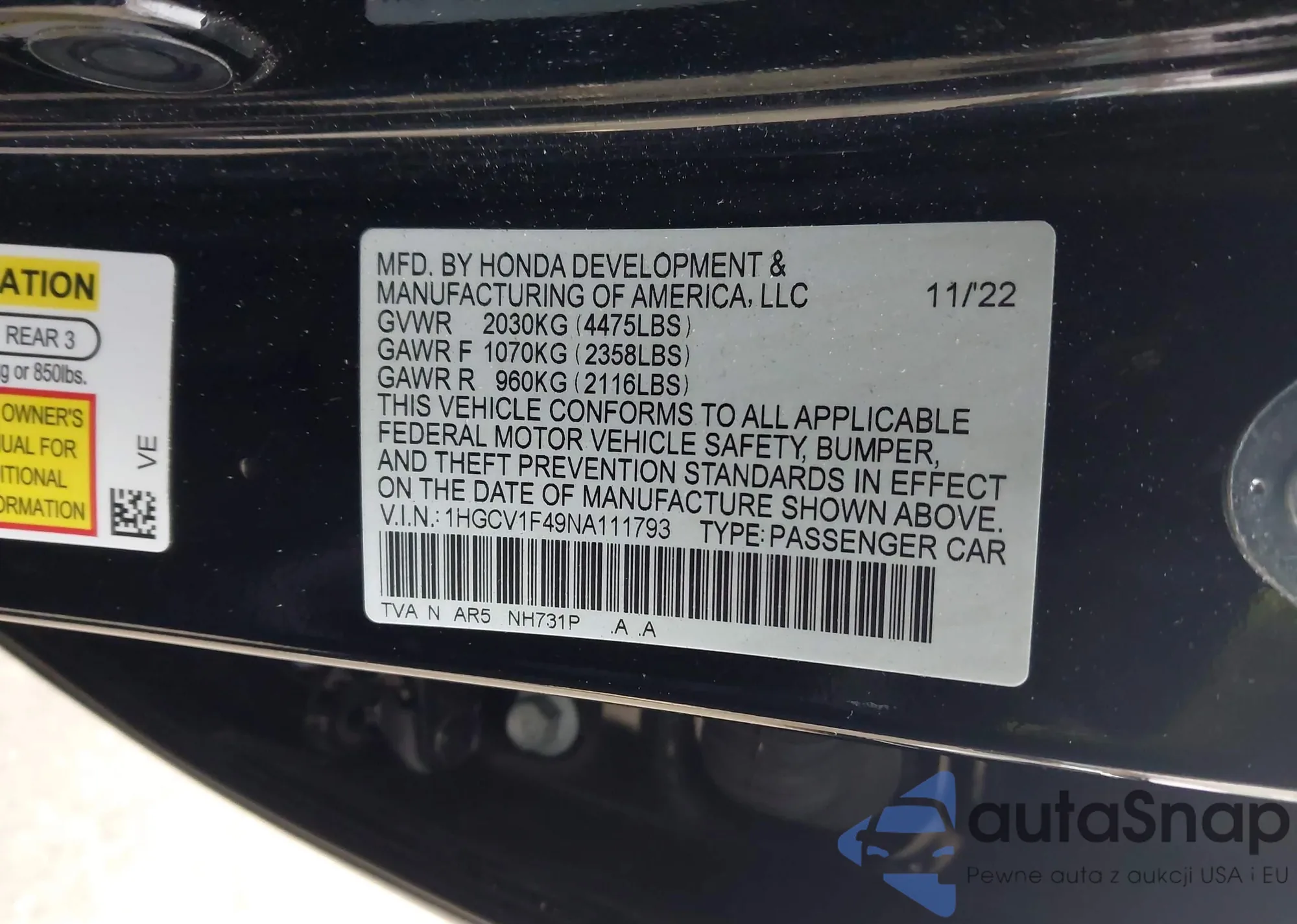 • VIN: 1HGCV1F49NA111793