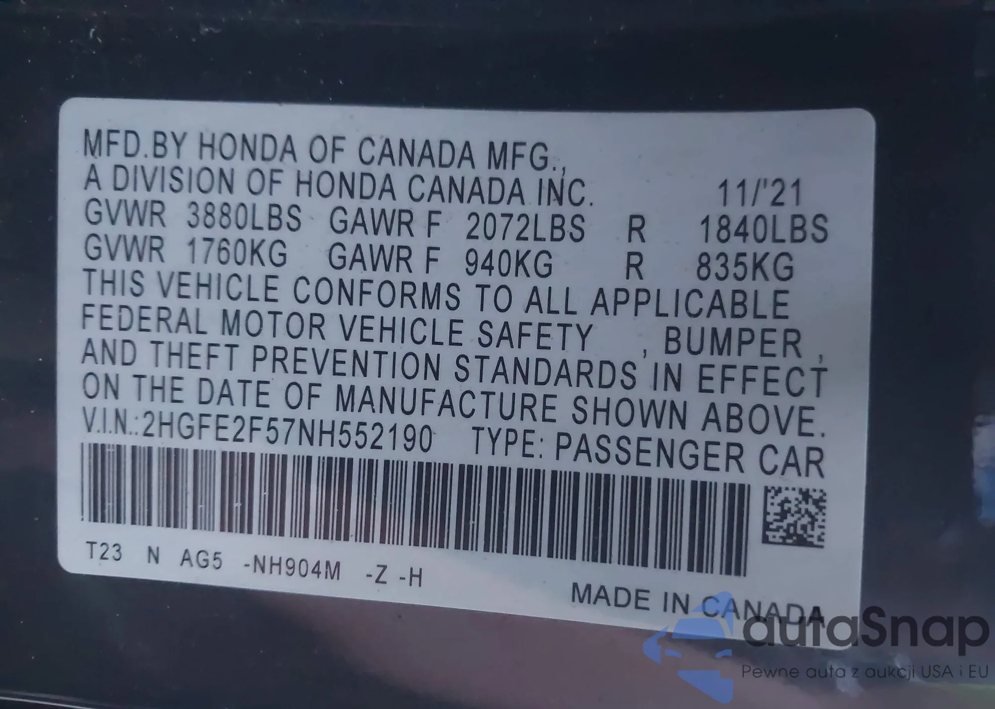 Samochód Honda Civic 2022 (VIN 2HGFE2F57NH552190) nie był wcześniej licytowany. Dokumenty są czyste, przebieg odpowiada lub jest niższy niż średnia rynku. Sprzedaje go firma ubezpieczeniowa – polecamy zakup. Dostawa do portu zajmie ok. 6–8 tygodni.