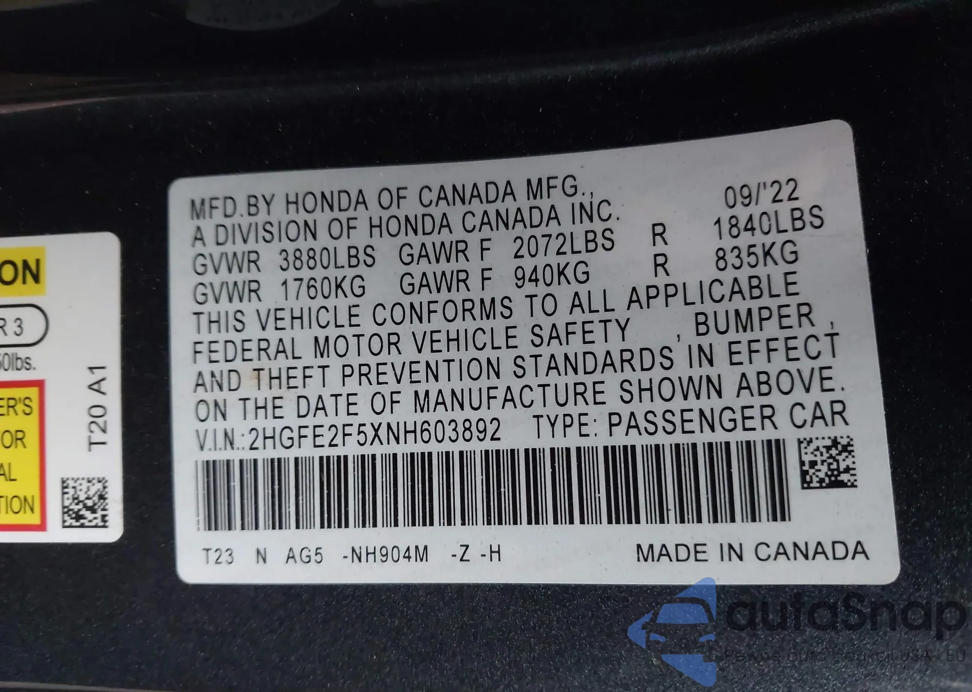 VIN: 2HGFE2F5XNH603892