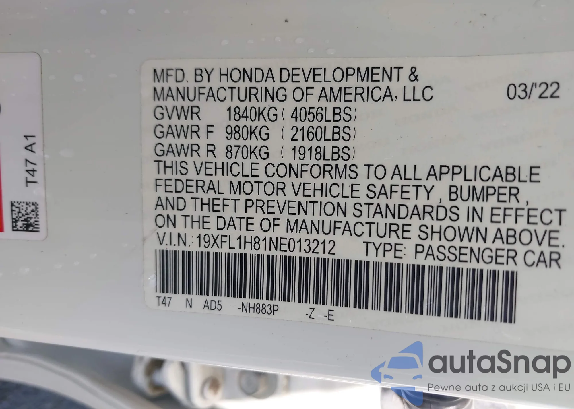 VIN: 19XFL1H81NE013212