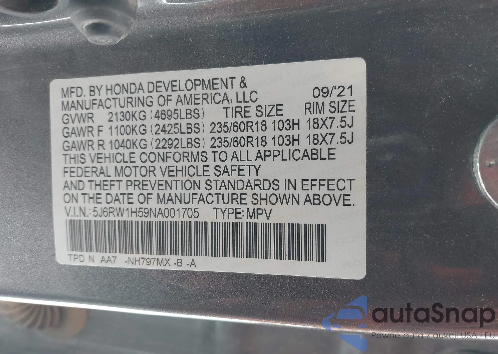 Samochód Honda CR-V 2022 (VIN 5J6RW1H59NA001705) nie był wcześniej licytowany. Dokumenty są czyste, przebieg odpowiada lub jest niższy niż średnia rynku. Sprzedaje go firma ubezpieczeniowa – polecamy zakup. Dostawa do portu zajmie ok. 6–8 tygodni.