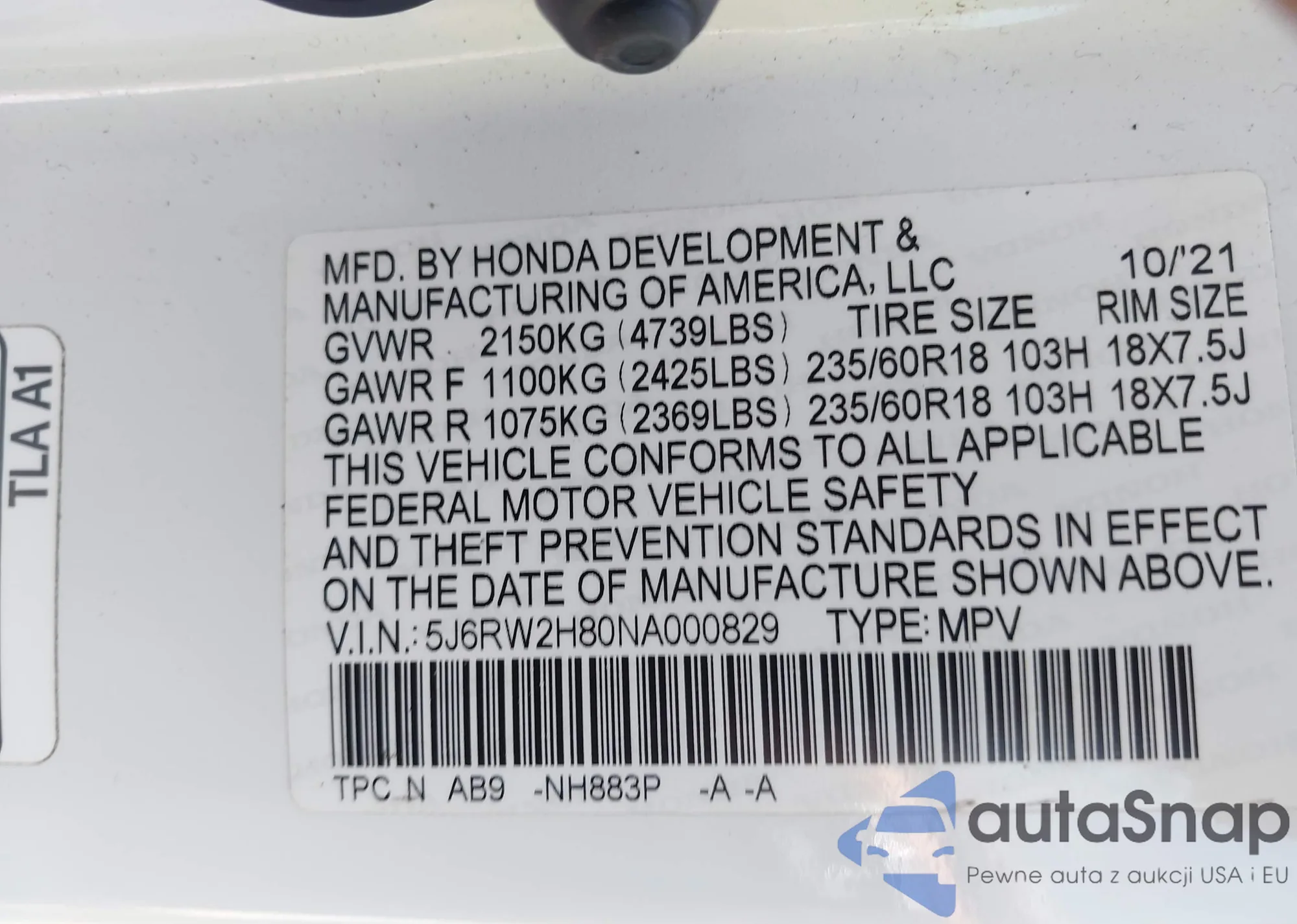 VIN: 5J6RW2H80NA000829