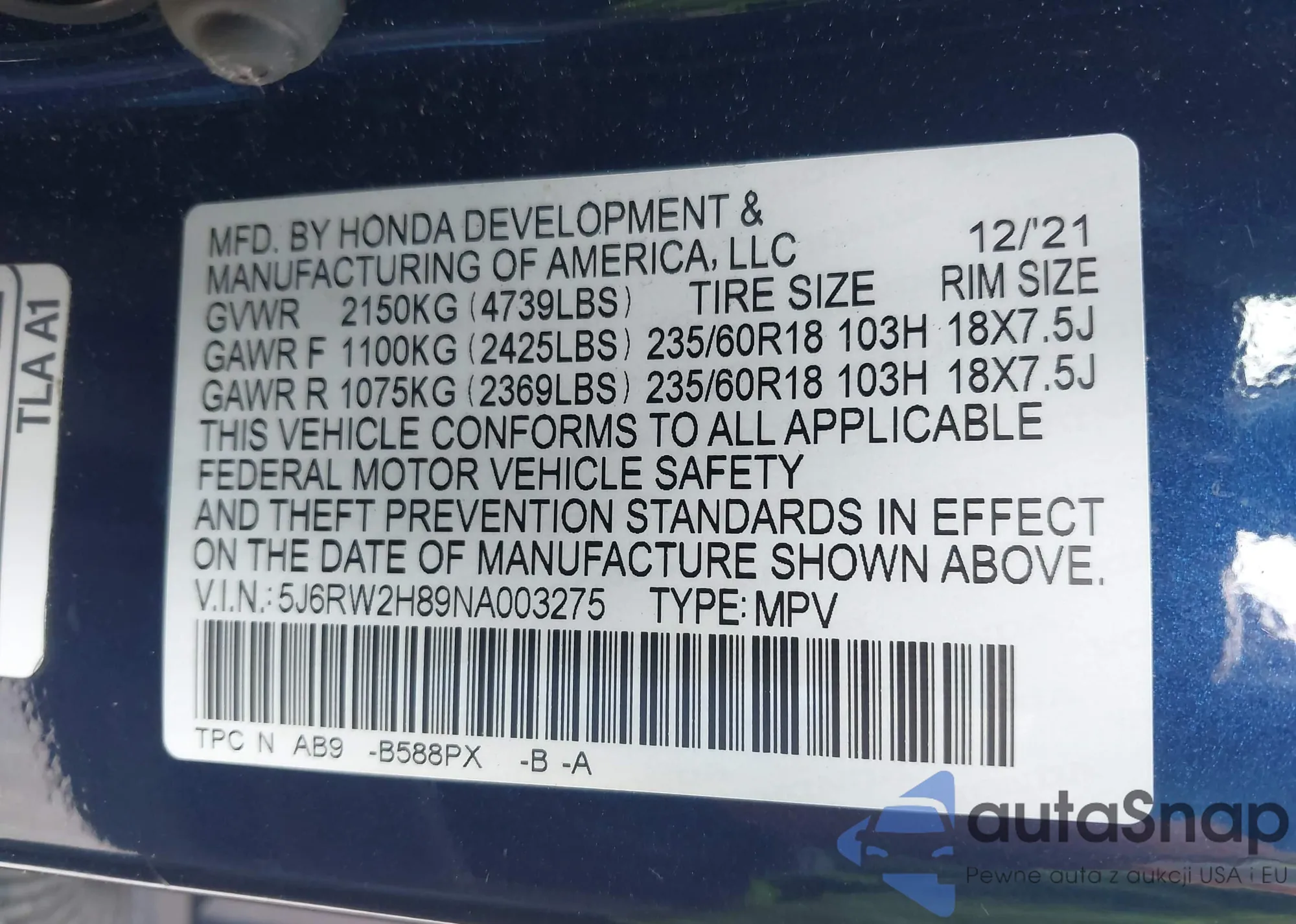 VIN: 5J6RW2H89NA003275