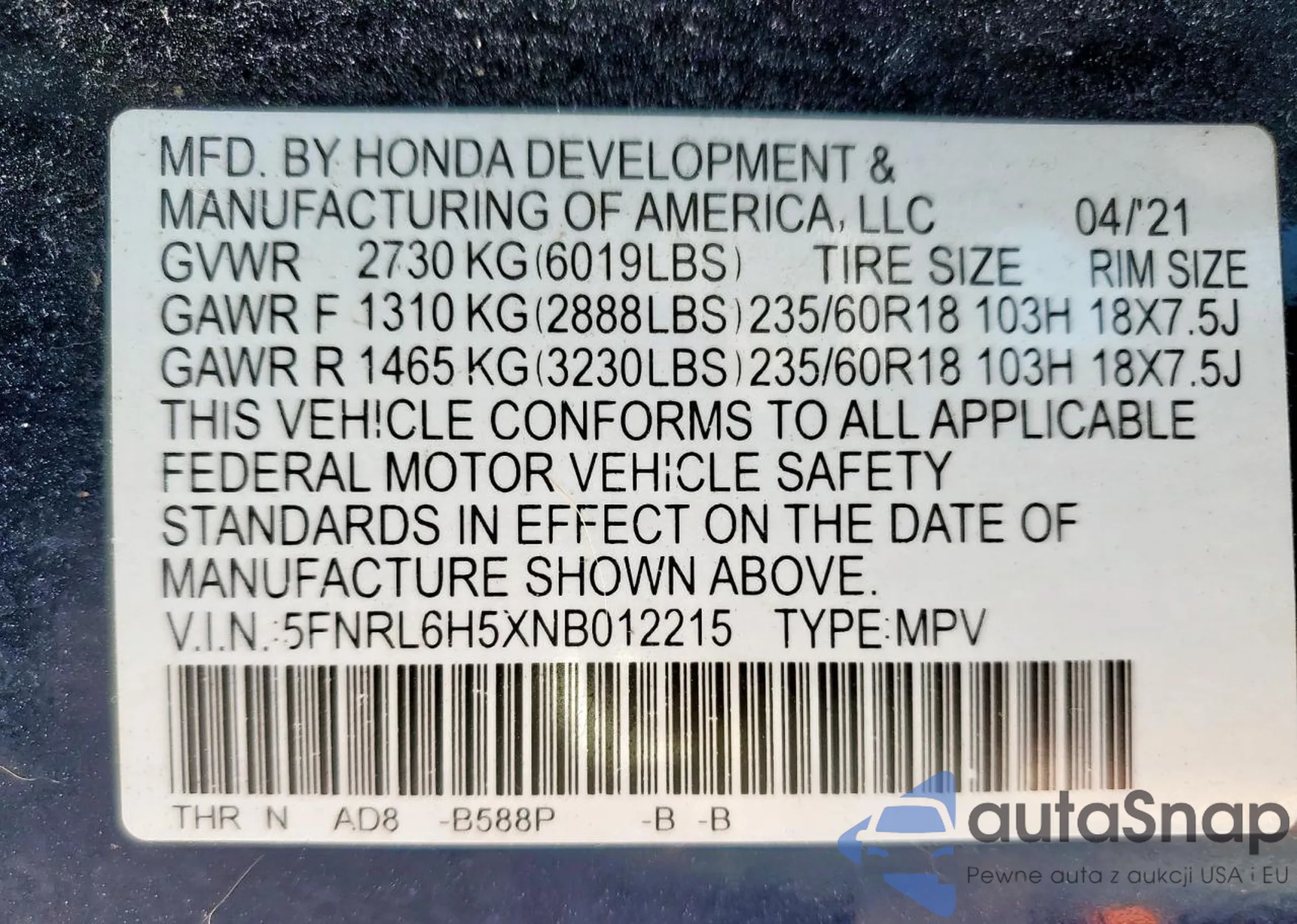 • VIN: 5FNRL6H5XNB012215