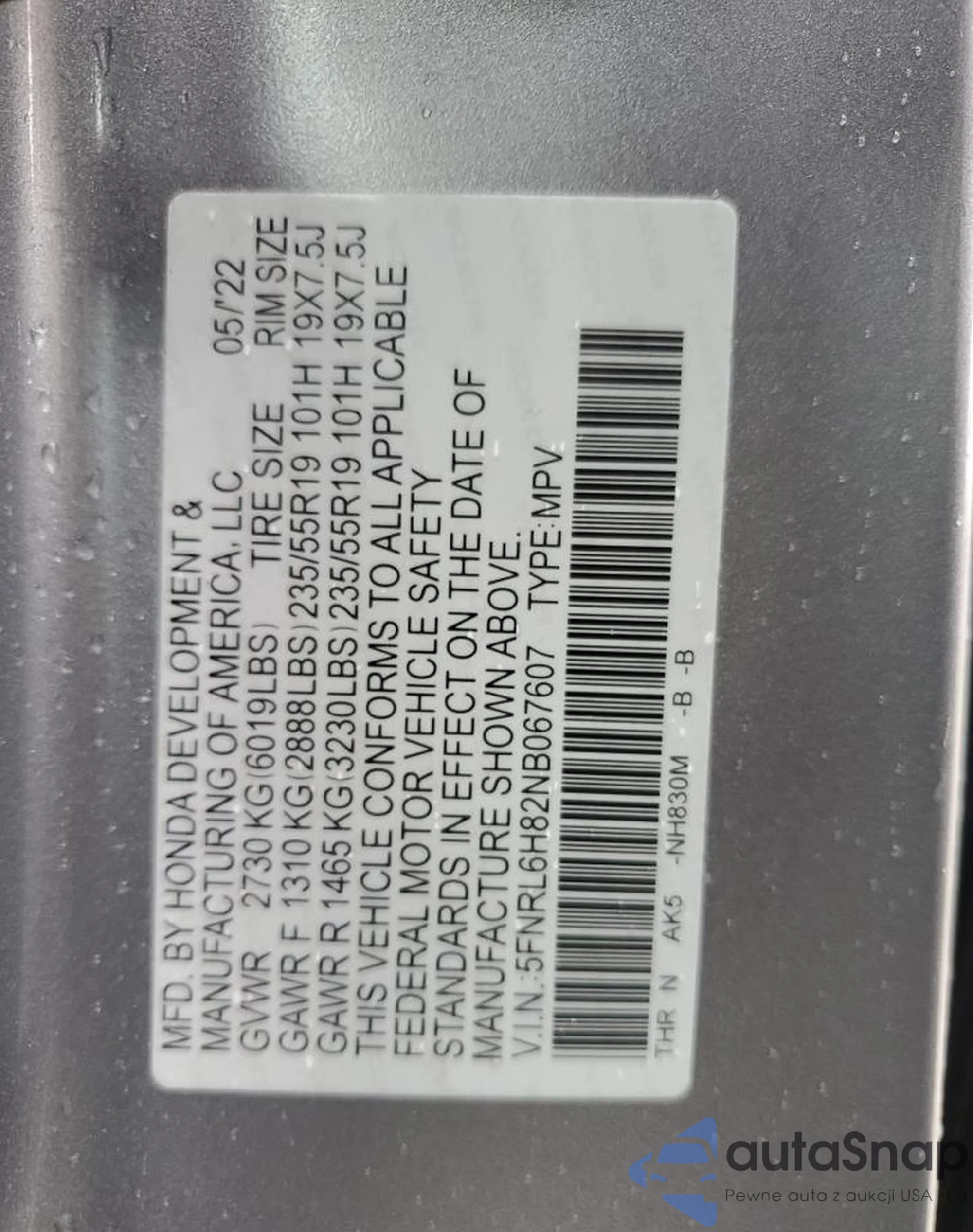 VIN: 5FNRL6H82NB067607
