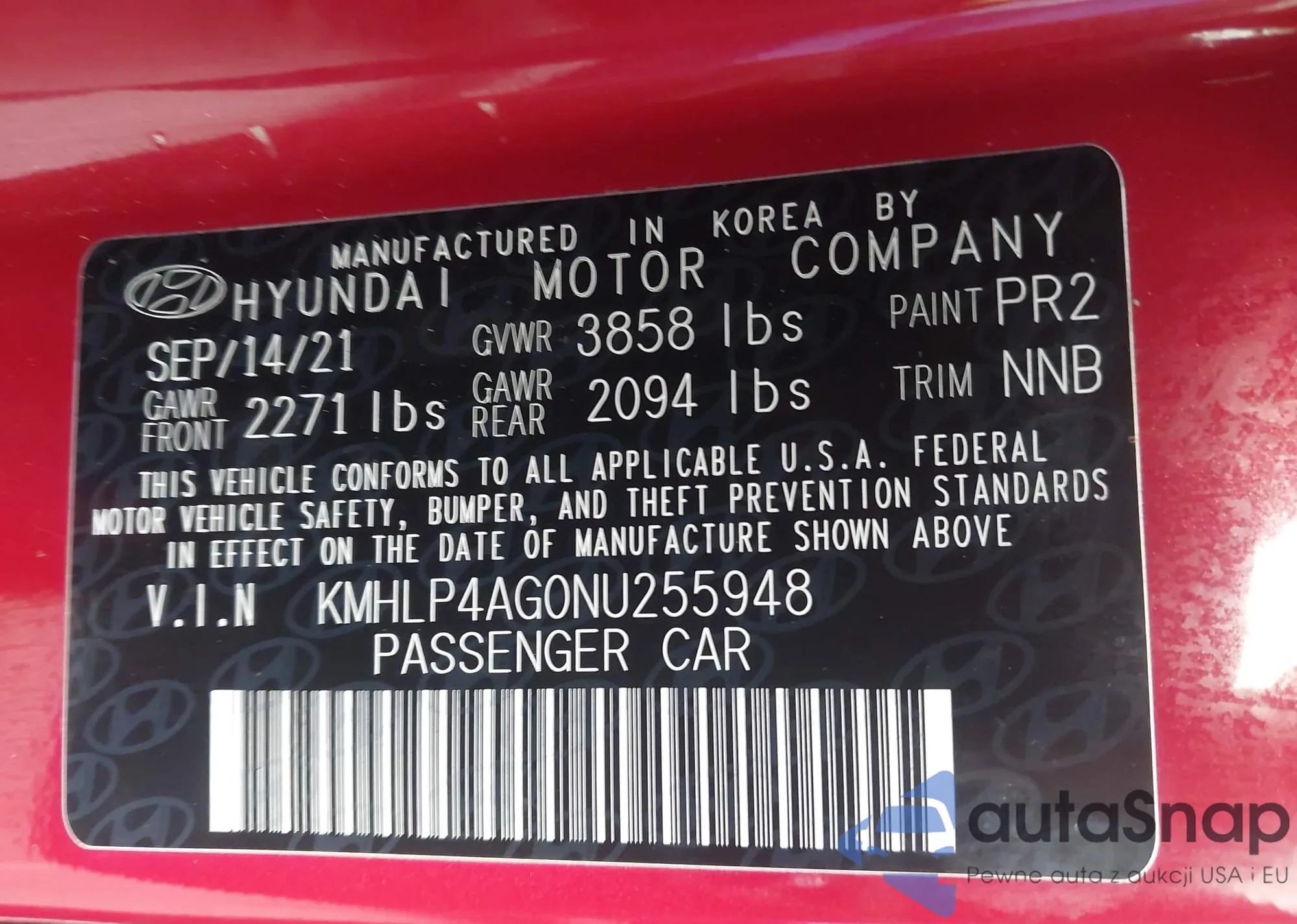 Samochód Hyundai Elantra 2022 (VIN KMHLP4AG0NU255948) ma dokumenty uniemożliwiające rejestrację. Mogą pojawić się trudności przy eksporcie i rejestracji. Skontaktuj się z ekspertami AutaSnap w celu znalezienia alternatywy.