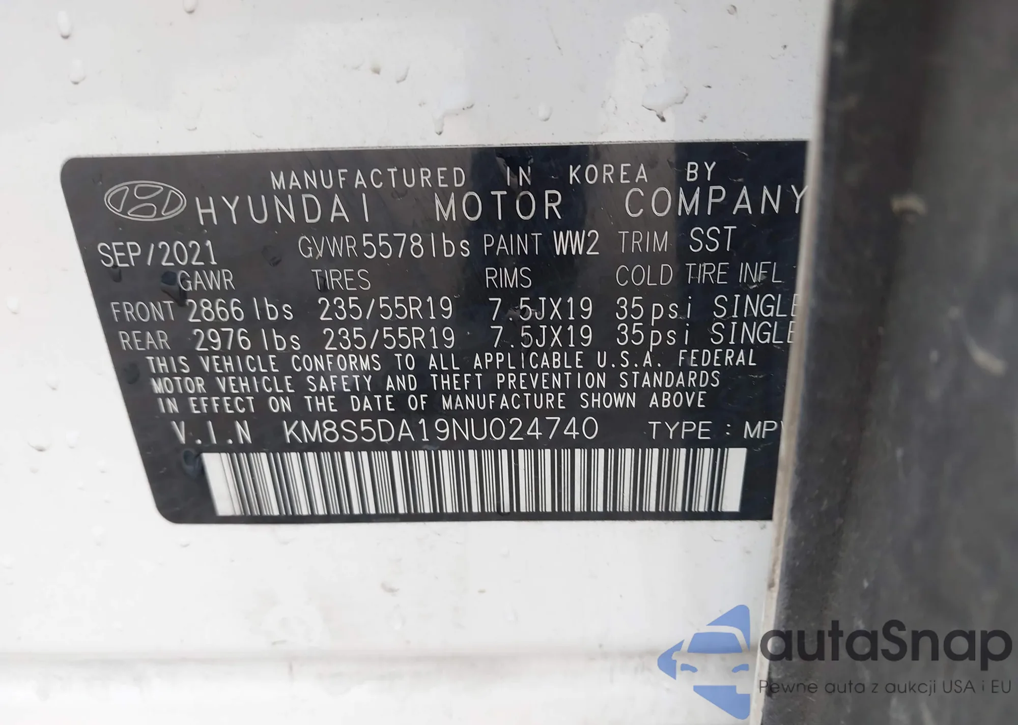 Samochód Hyundai Santa Fe 2022 (VIN KM8S5DA19NU024740) nie był wcześniej licytowany. Dokumenty są czyste, przebieg odpowiada lub jest niższy niż średnia rynku. Sprzedaje go firma ubezpieczeniowa – polecamy zakup. Dostawa do portu zajmie ok. 6–8 tygodni.