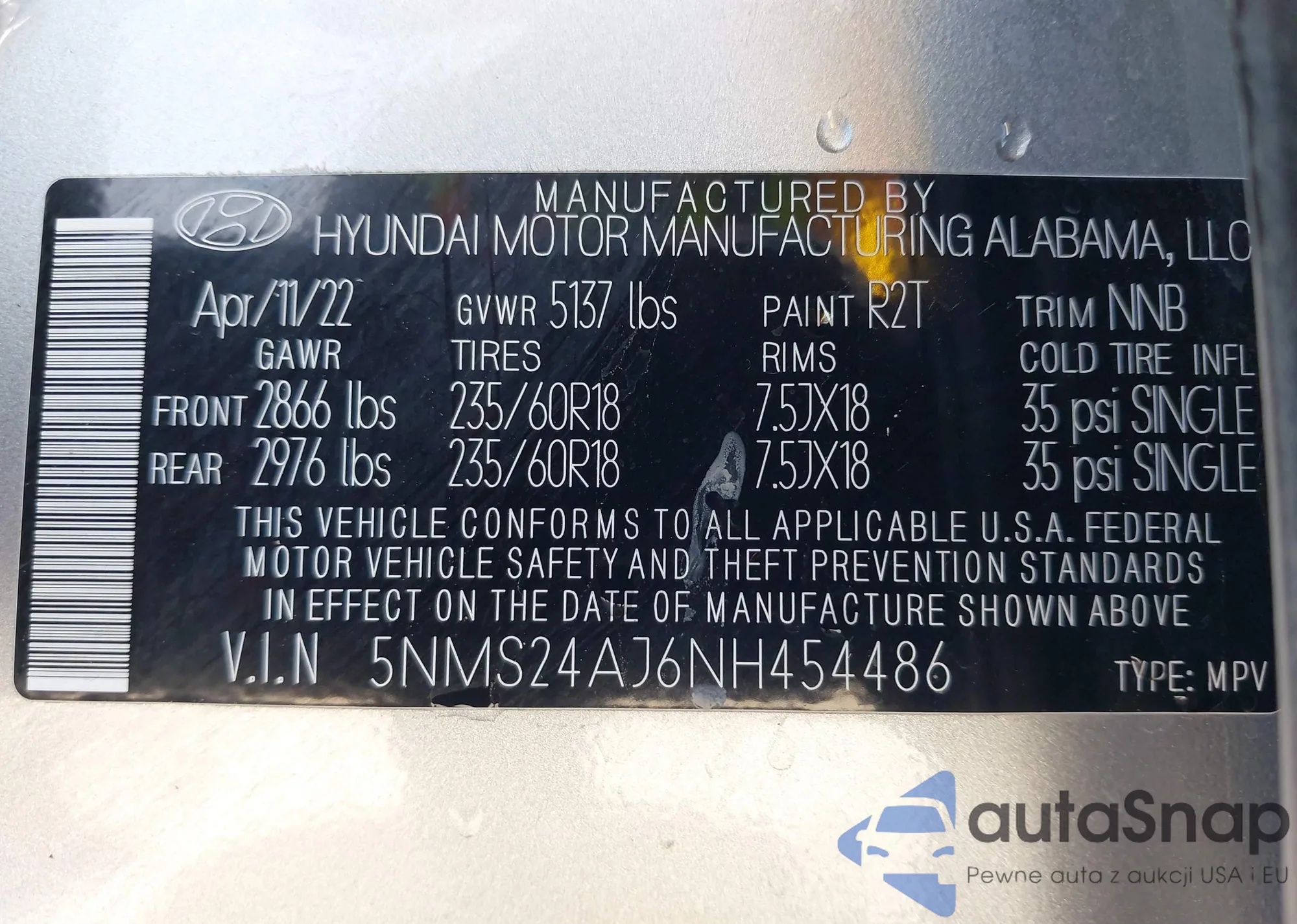 Samochód Hyundai Santa Fe 2022 (VIN 5NMS24AJ6NH454486) nie był wcześniej licytowany. Dokumenty są czyste, przebieg odpowiada lub jest niższy niż średnia rynku. Sprzedaje go firma ubezpieczeniowa – polecamy zakup. Dostawa do portu zajmie ok. 6–8 tygodni.
