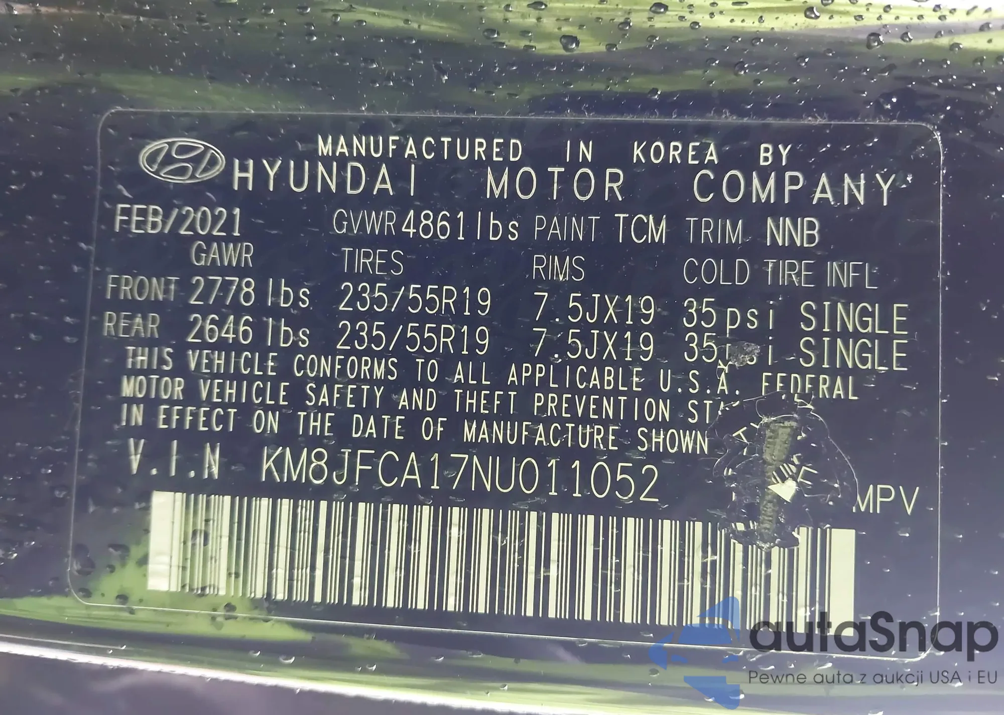 Samochód Hyundai Tucson 2022 (VIN KM8JFCA17NU011052) nie był wcześniej licytowany. Dokumenty są czyste, przebieg odpowiada lub jest niższy niż średnia rynku. Sprzedaje go firma ubezpieczeniowa – polecamy zakup. Dostawa do portu zajmie ok. 6–8 tygodni.
