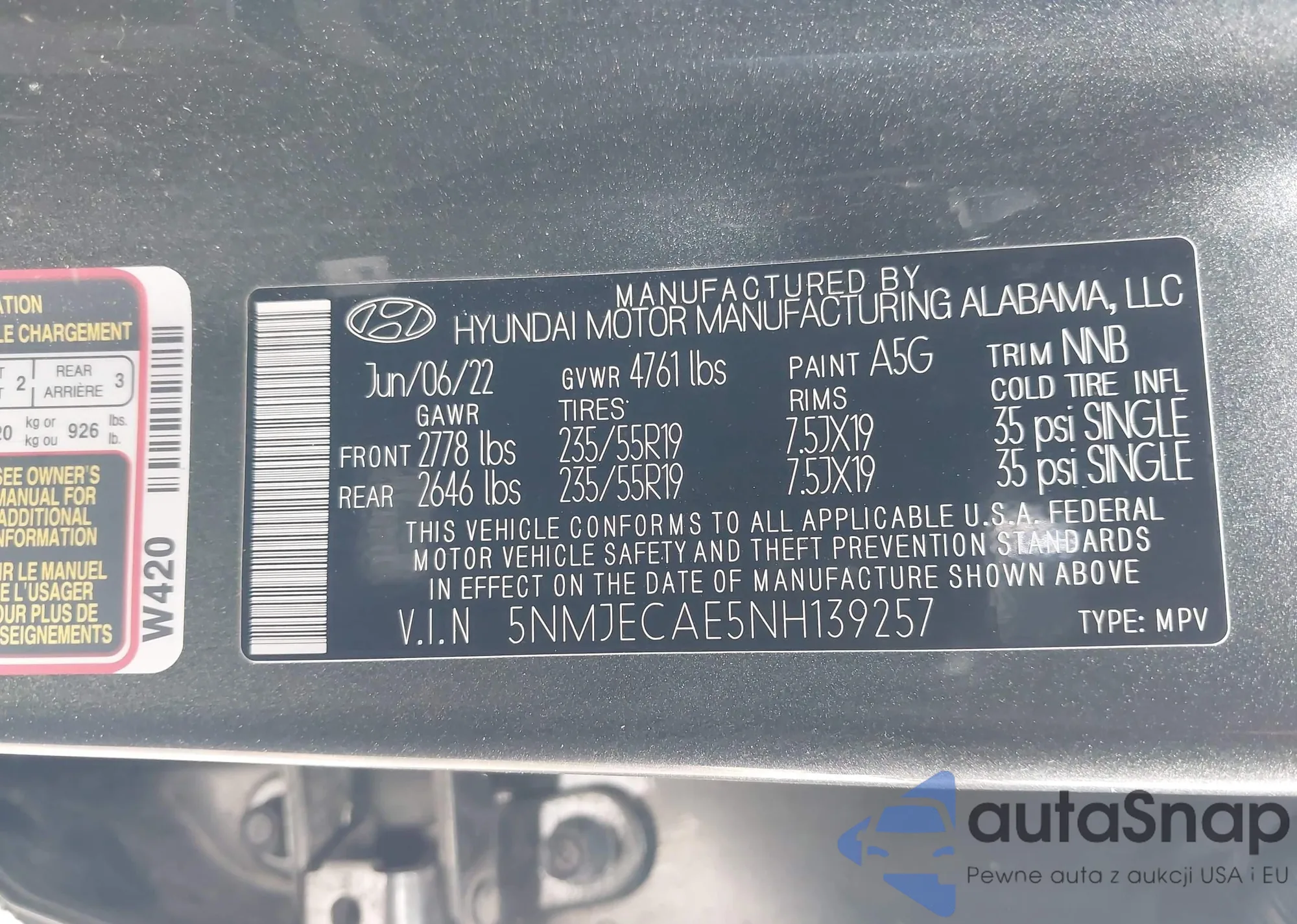 • VIN: 5NMJECAE5NH139257