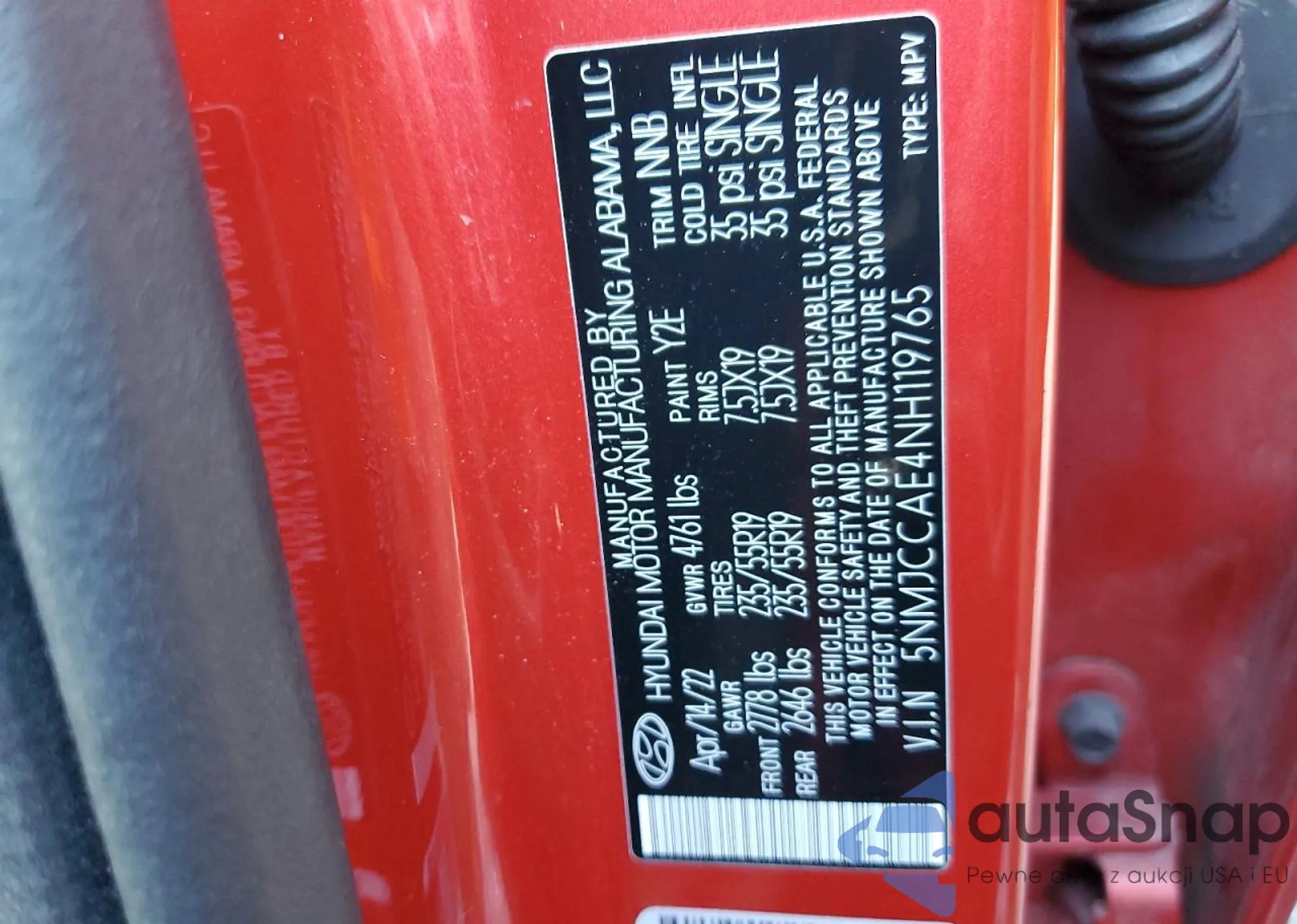 Samochód Hyundai Tucson 2022 (VIN 5NMJCCAE4NH119765) sprzedaje go niezweryfikowany sprzedawca. Zalecamy raport Carfax i potwierdzenie możliwości rejestracji pojazdu przed zakupem.
