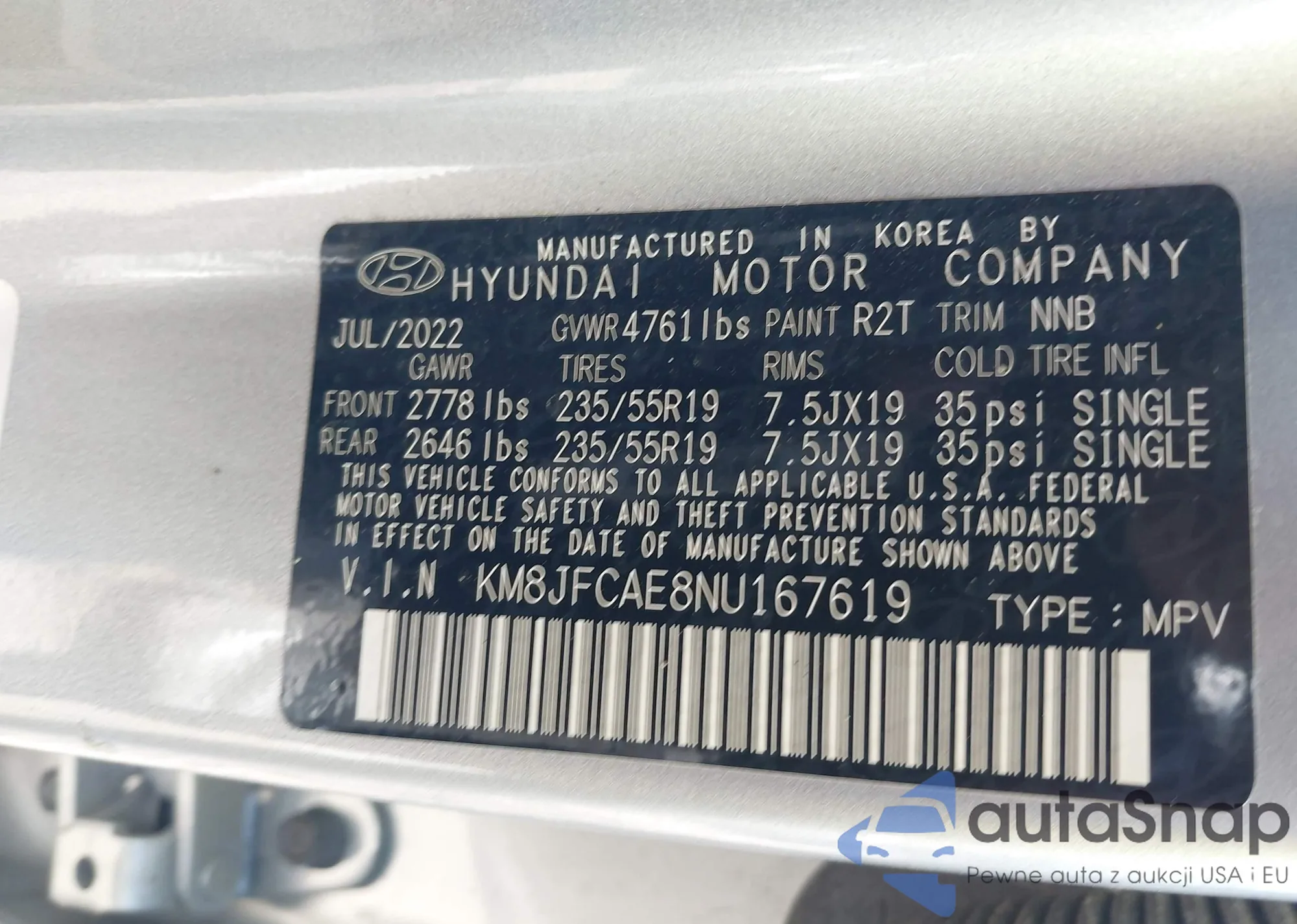 • VIN: KM8JFCAE8NU167619