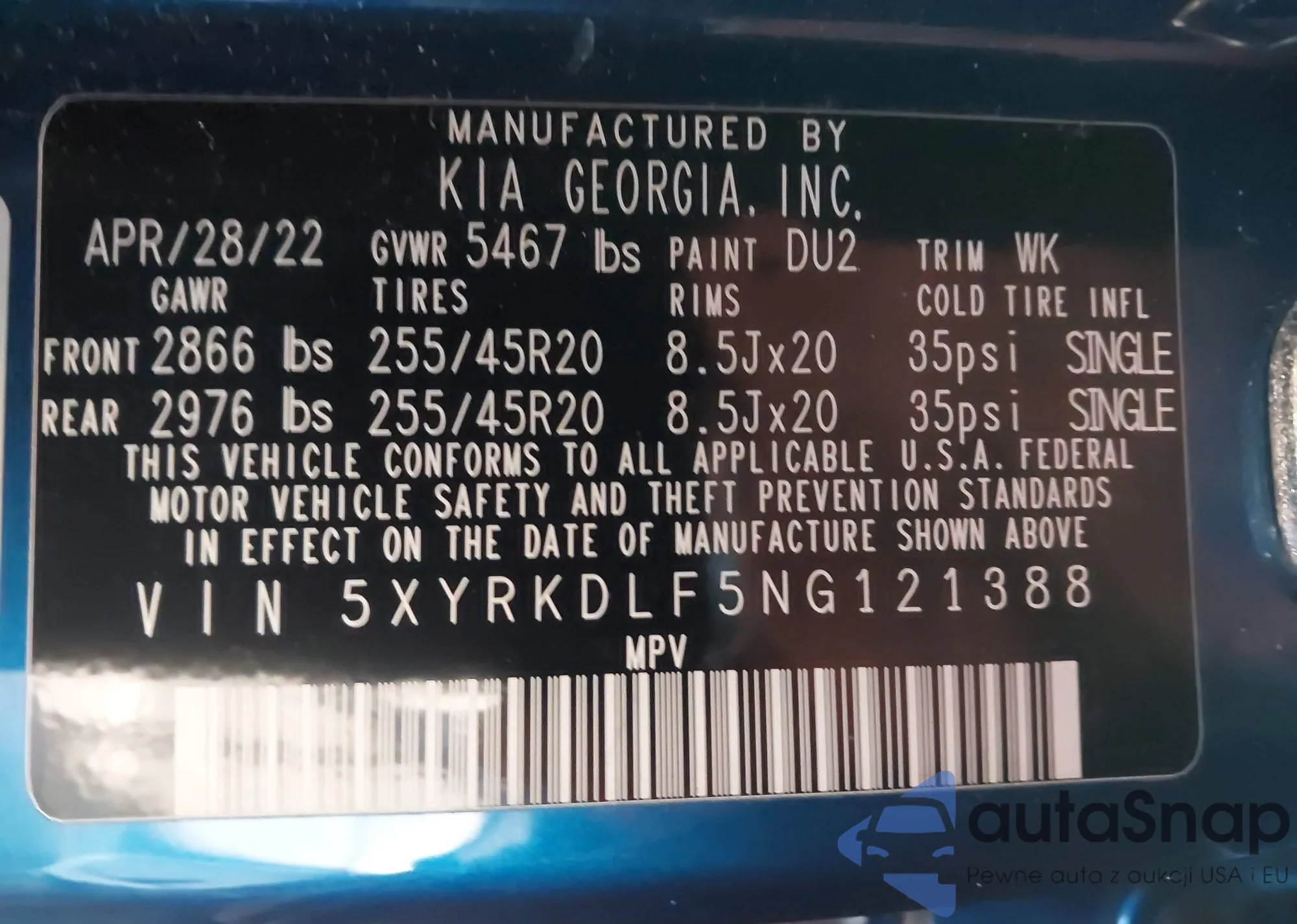 • VIN: 5XYRKDLF5NG121388