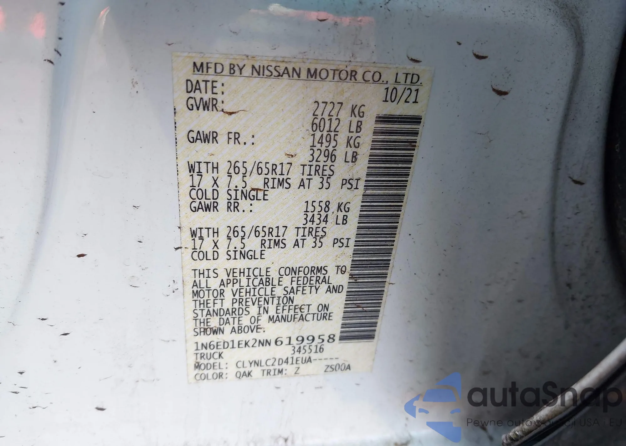 Samochód Nissan Navara (Frontier) 2022 (VIN 1N6ED1EK2NN619958) nie był wcześniej licytowany. Dokumenty są czyste, przebieg odpowiada lub jest niższy niż średnia rynku. Sprzedaje go firma ubezpieczeniowa – polecamy zakup. Dostawa do portu zajmie ok. 6–8 tygodni.