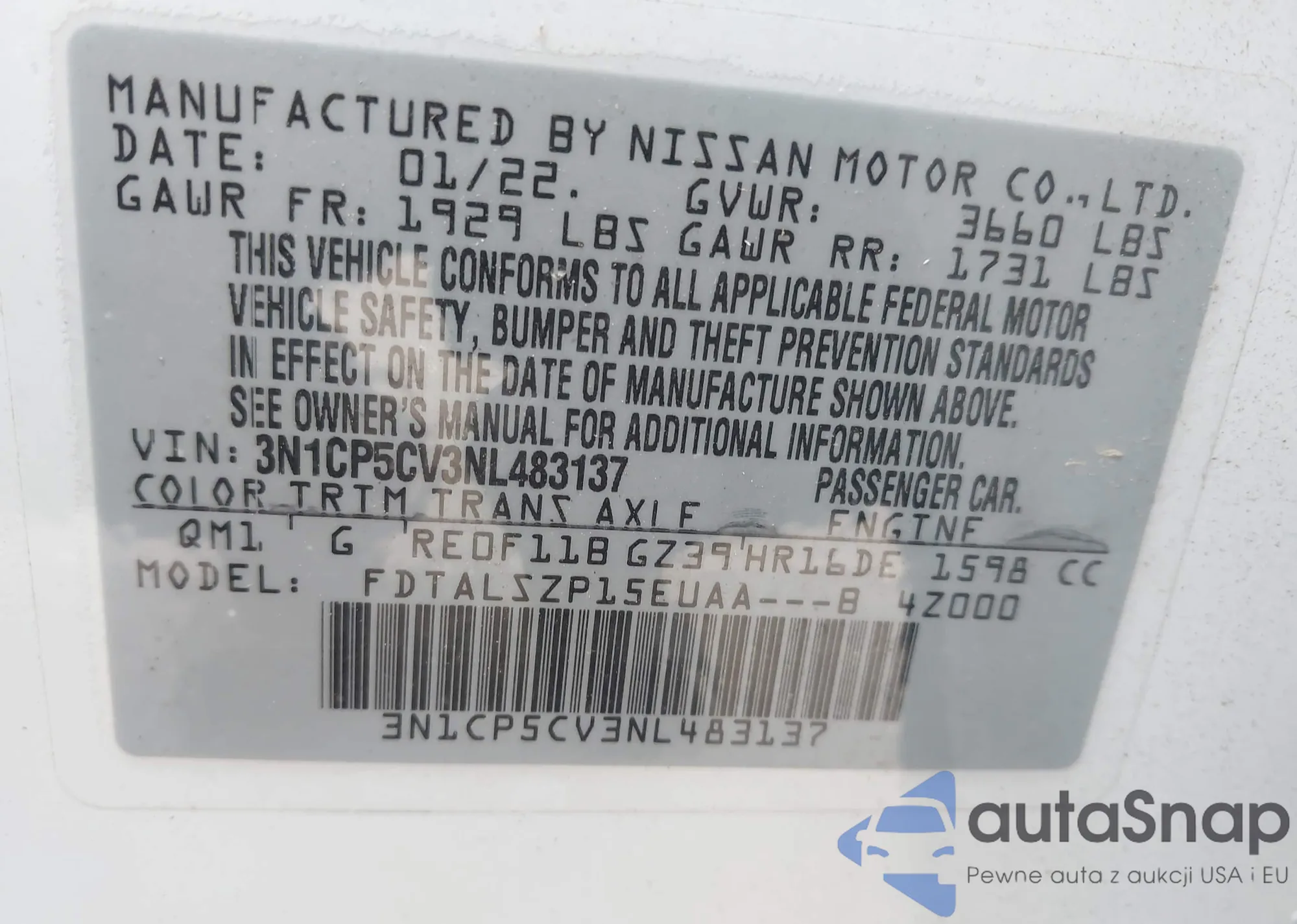 VIN: 3N1CP5CV3NL483137