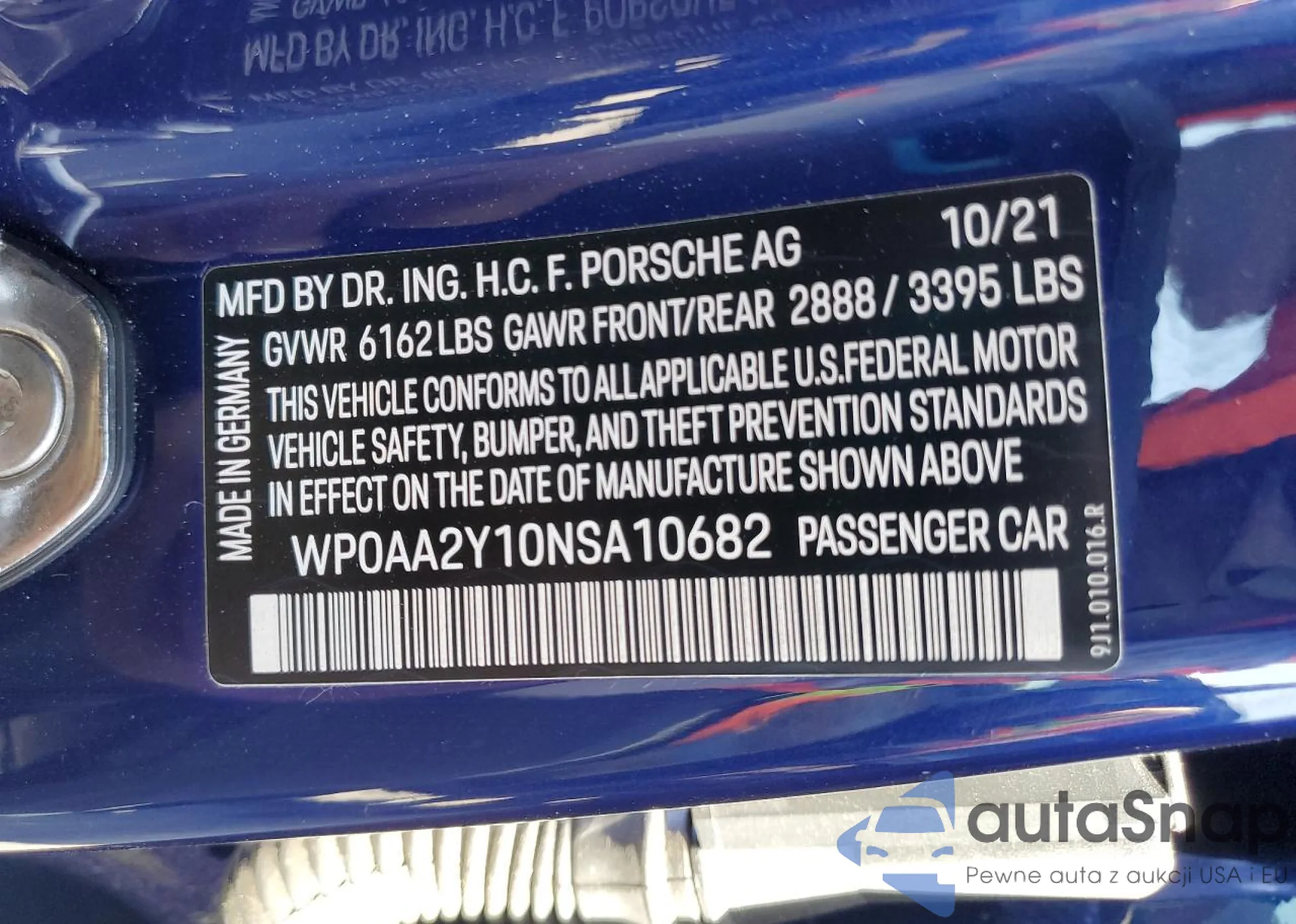Samochód Porsche Taycan 2022 (VIN WP0AA2Y10NSA10682) nie był wcześniej licytowany. Dokumenty są czyste, przebieg odpowiada lub jest niższy niż średnia rynku. Sprzedaje go firma ubezpieczeniowa – polecamy zakup. Dostawa do portu zajmie ok. 6–8 tygodni.