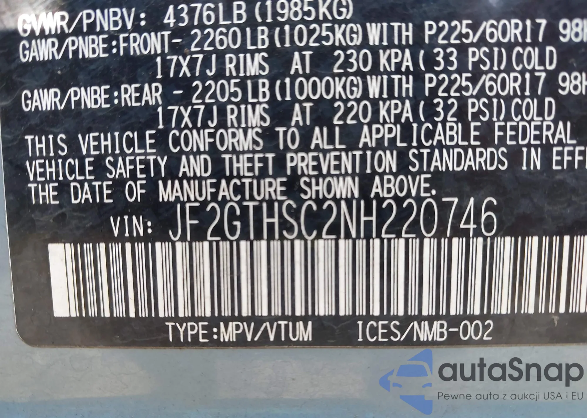 VIN: JF2GTHSC2NH220746