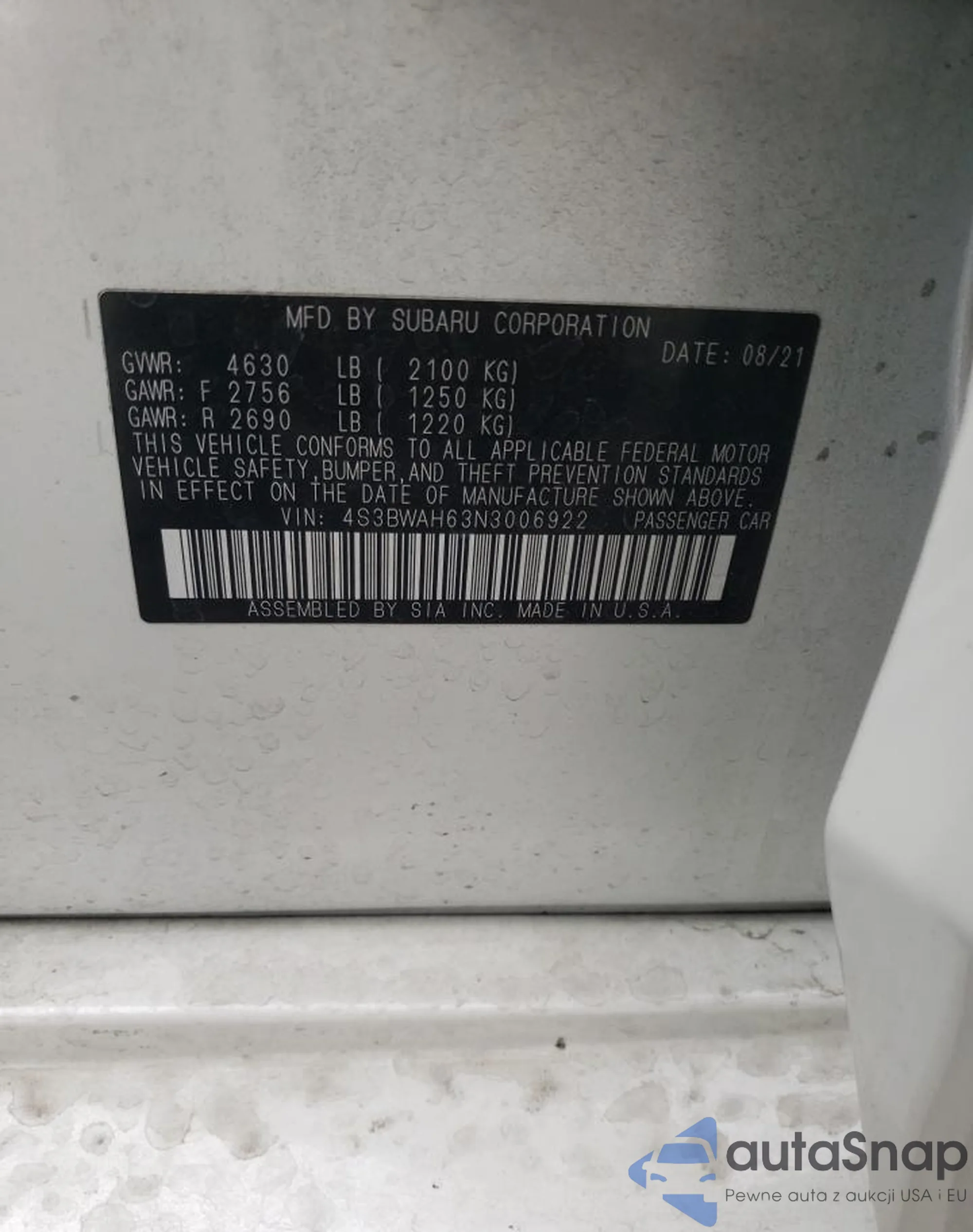 4S3BWAH63N3006922 COPART