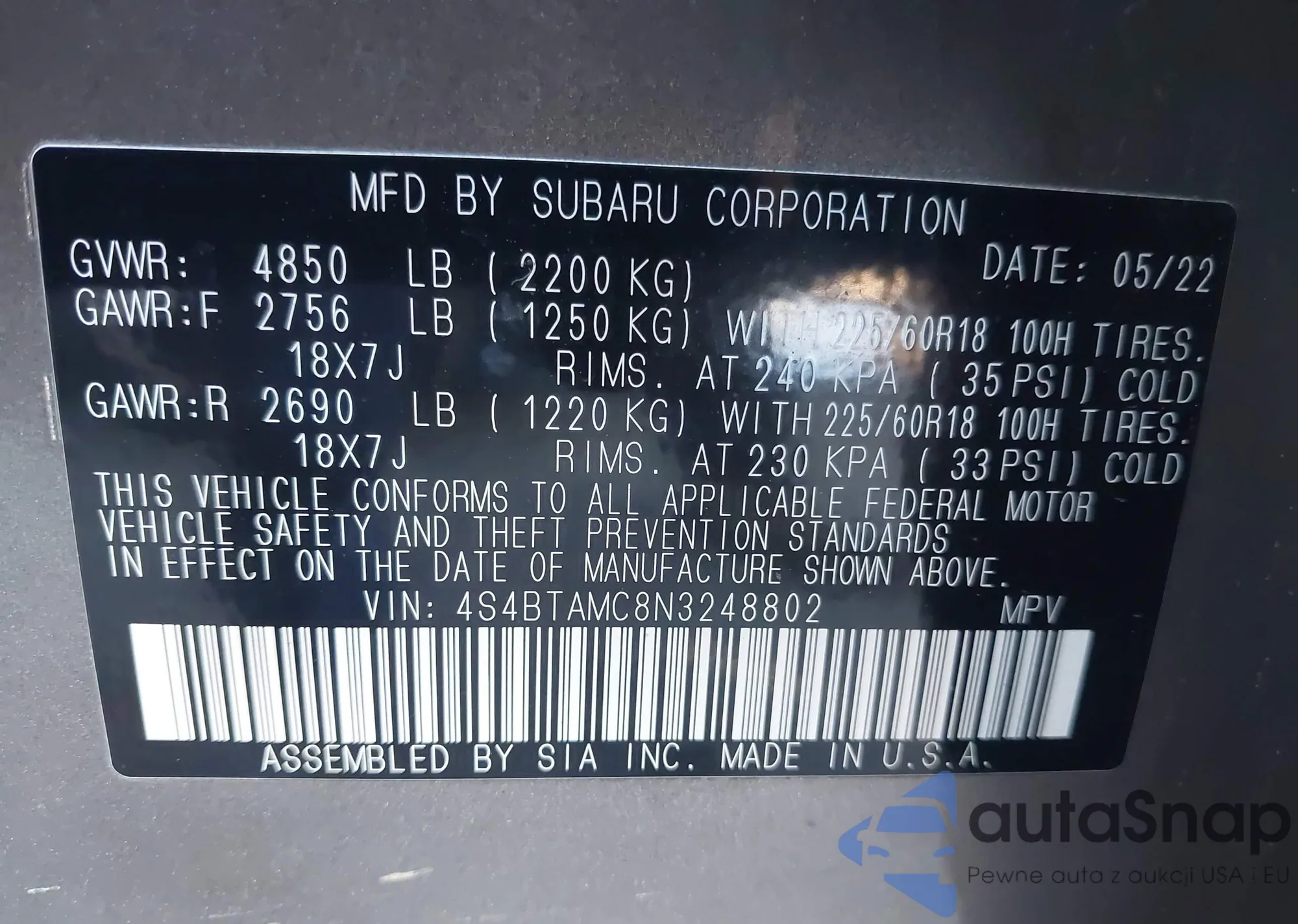 Samochód Subaru Outback 2022 (VIN 4S4BTAMC8N3248802) nie był wcześniej licytowany. Dokumenty są czyste, przebieg odpowiada lub jest niższy niż średnia rynku. Sprzedaje go firma ubezpieczeniowa – polecamy zakup. Dostawa do portu zajmie ok. 6–8 tygodni.