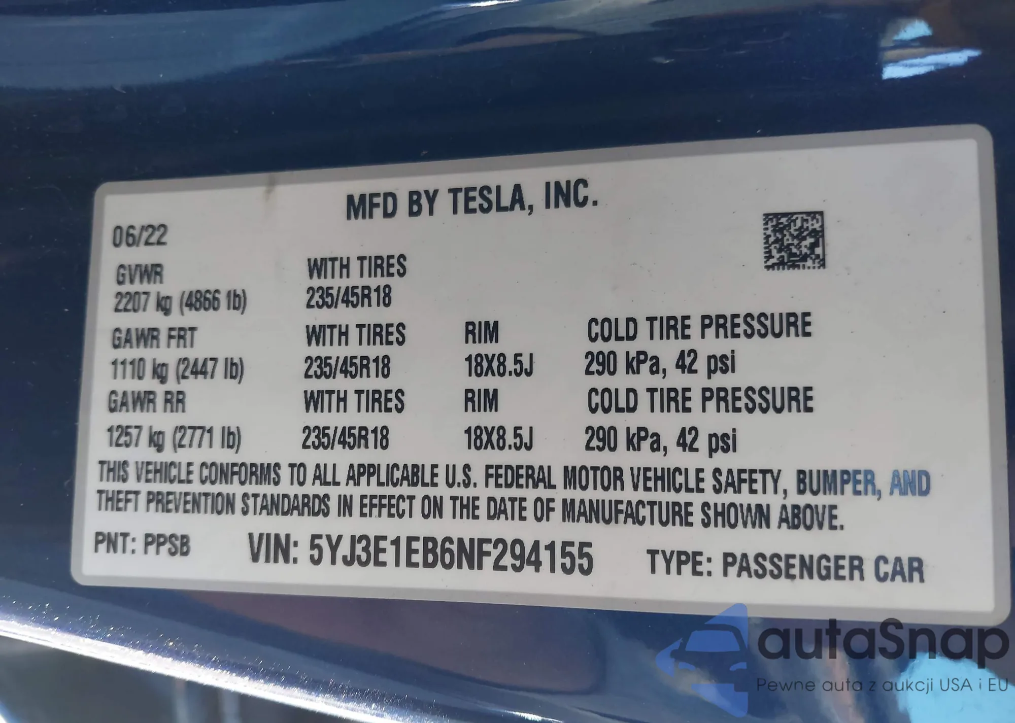 VIN: 5YJ3E1EB6NF294155