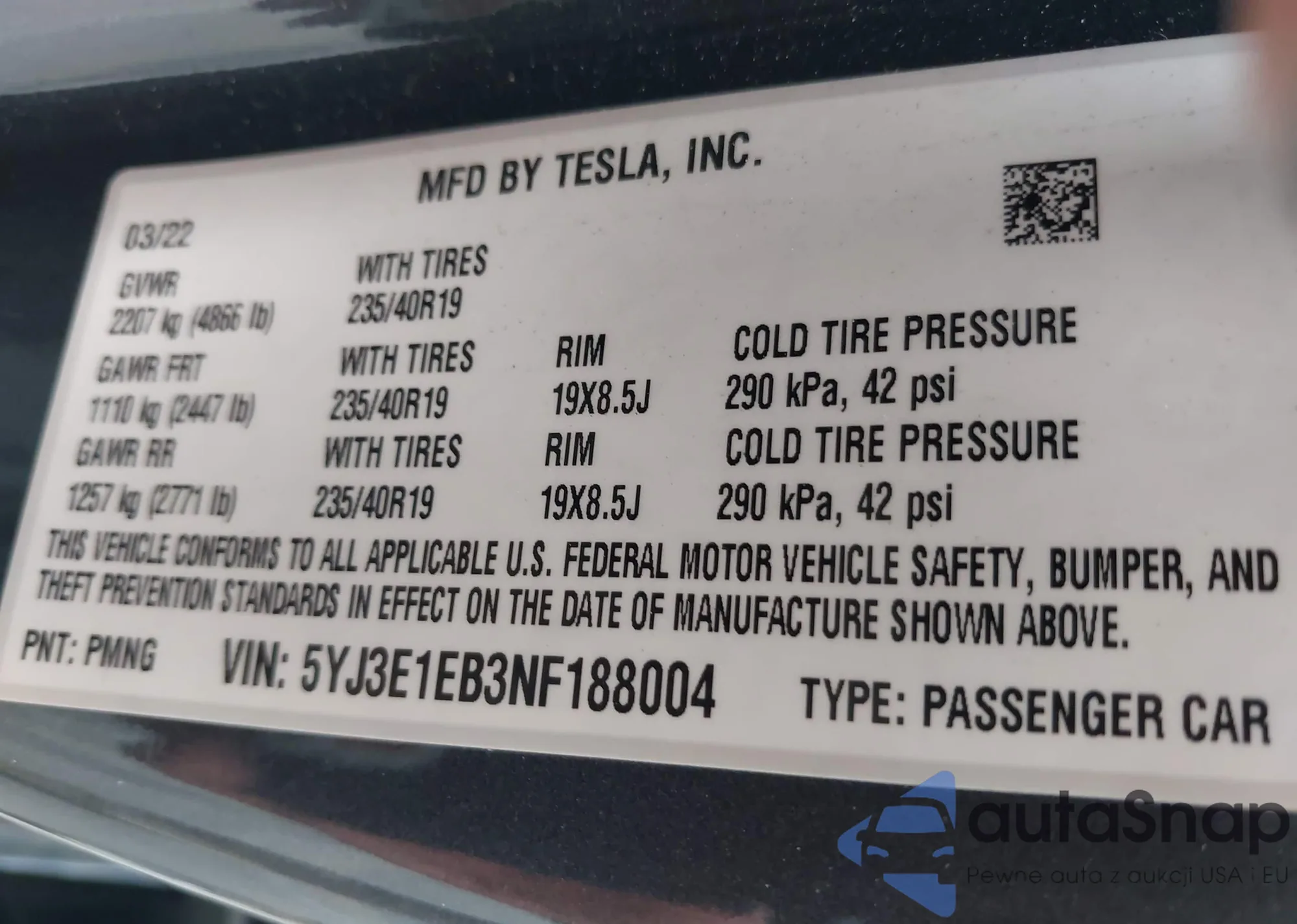 VIN: 5YJ3E1EB3NF188004
