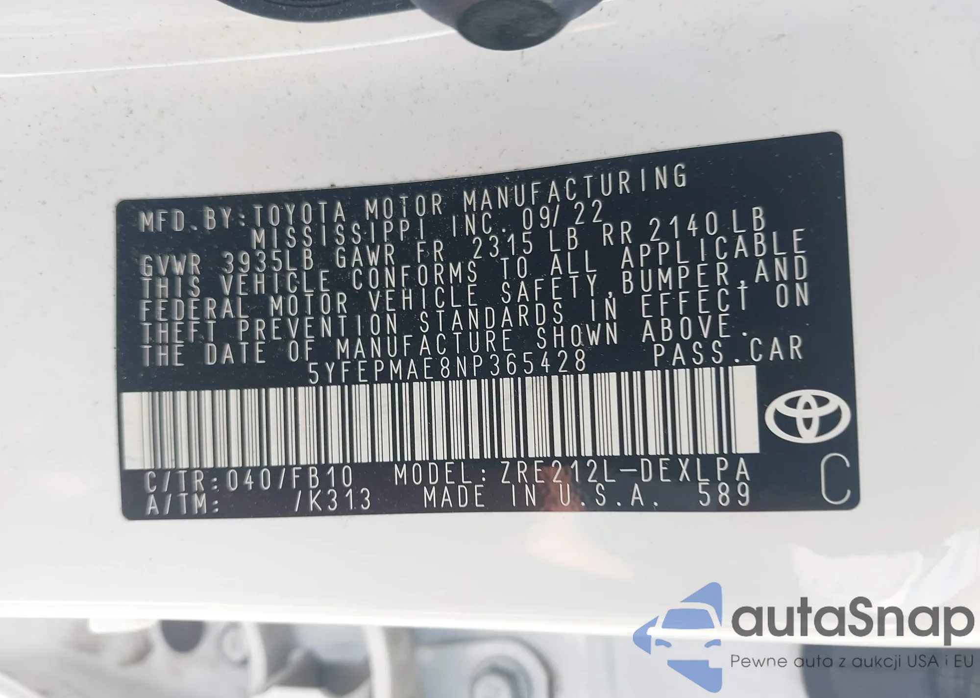 VIN: 5YFEPMAE8NP365428