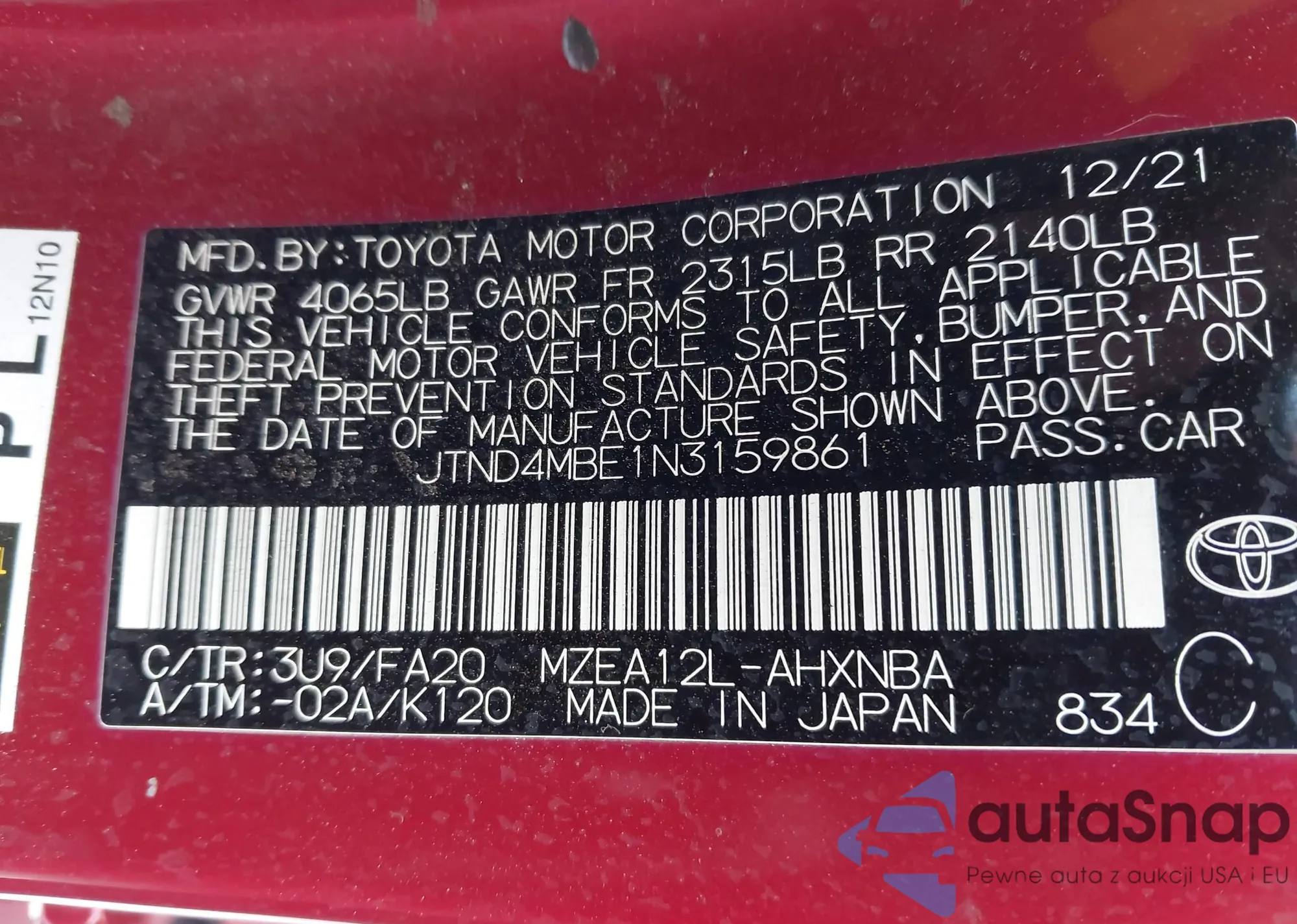 Samochód Toyota Corolla 2022 (VIN JTND4MBE1N3159861) nie był wcześniej licytowany. Dokumenty są czyste, przebieg odpowiada lub jest niższy niż średnia rynku. Sprzedaje go firma ubezpieczeniowa – polecamy zakup. Dostawa do portu zajmie ok. 6–8 tygodni.